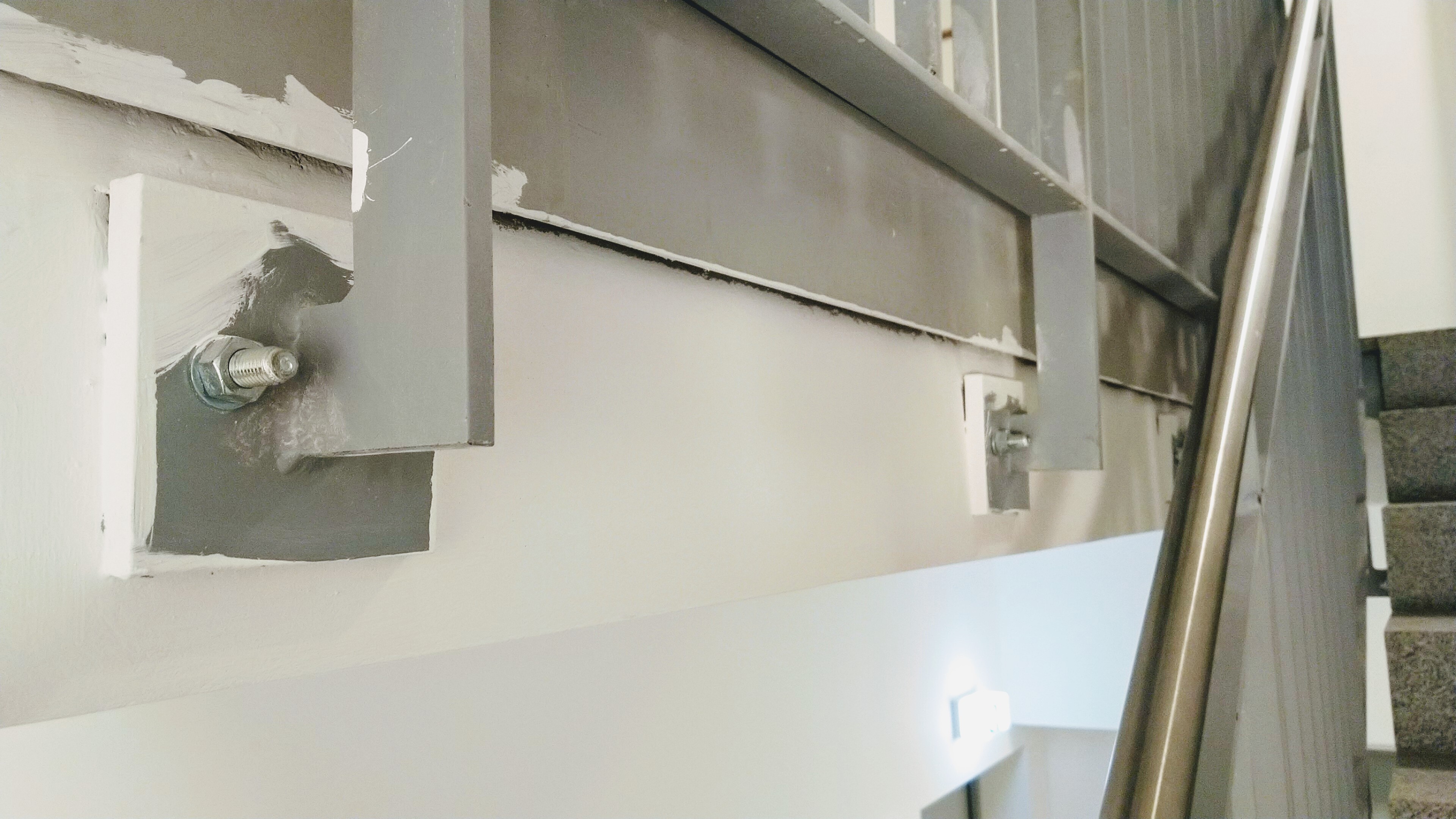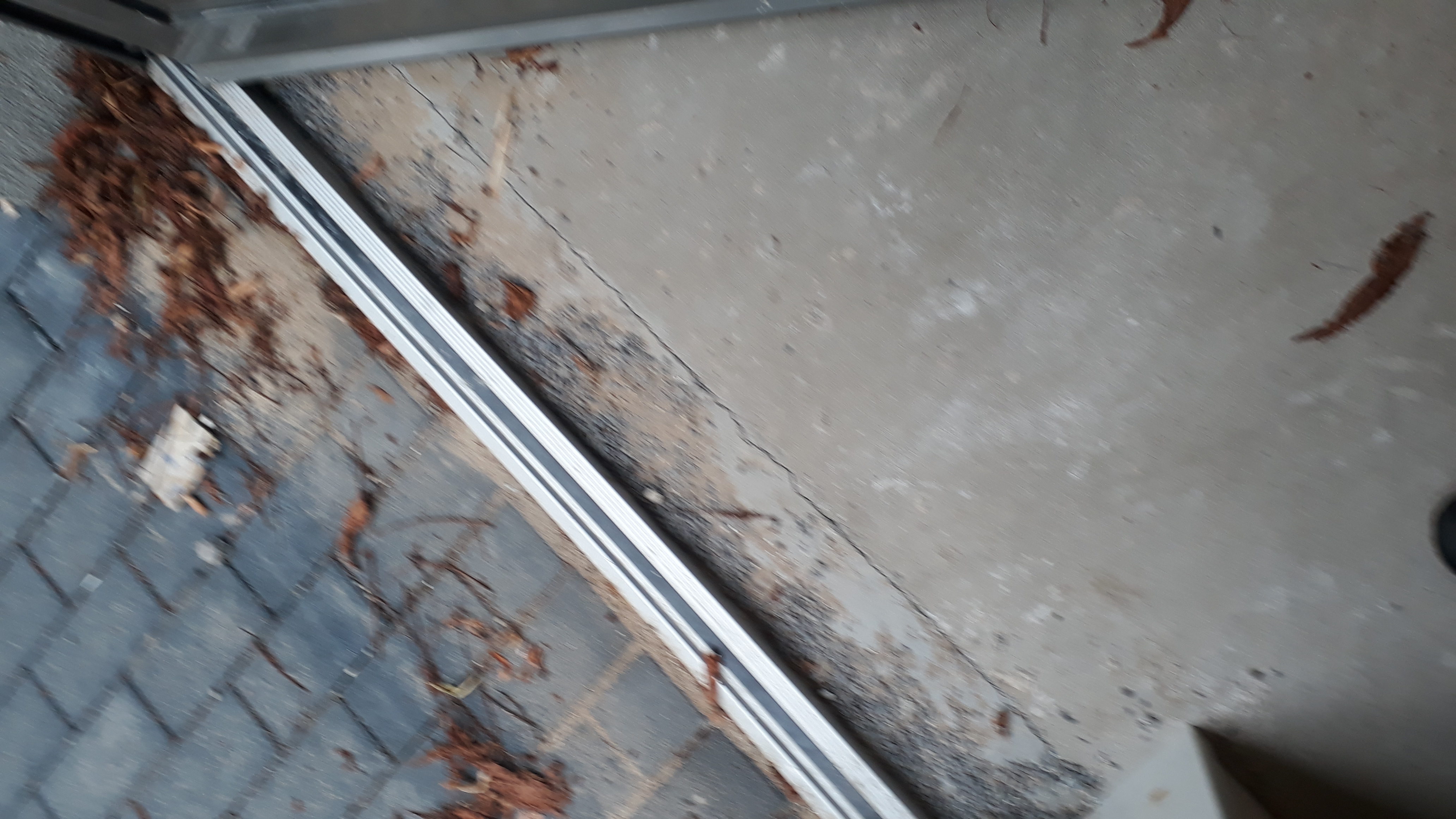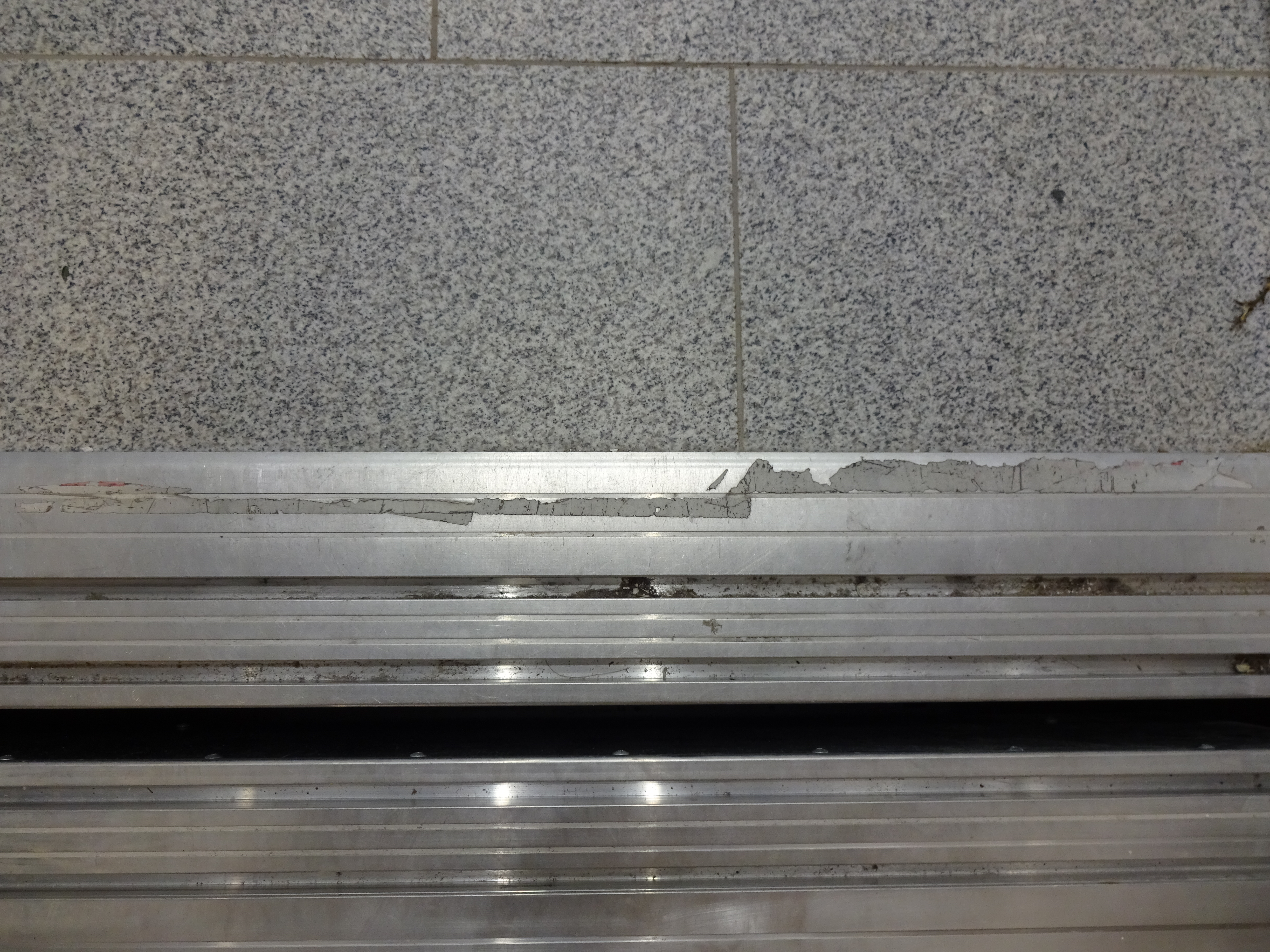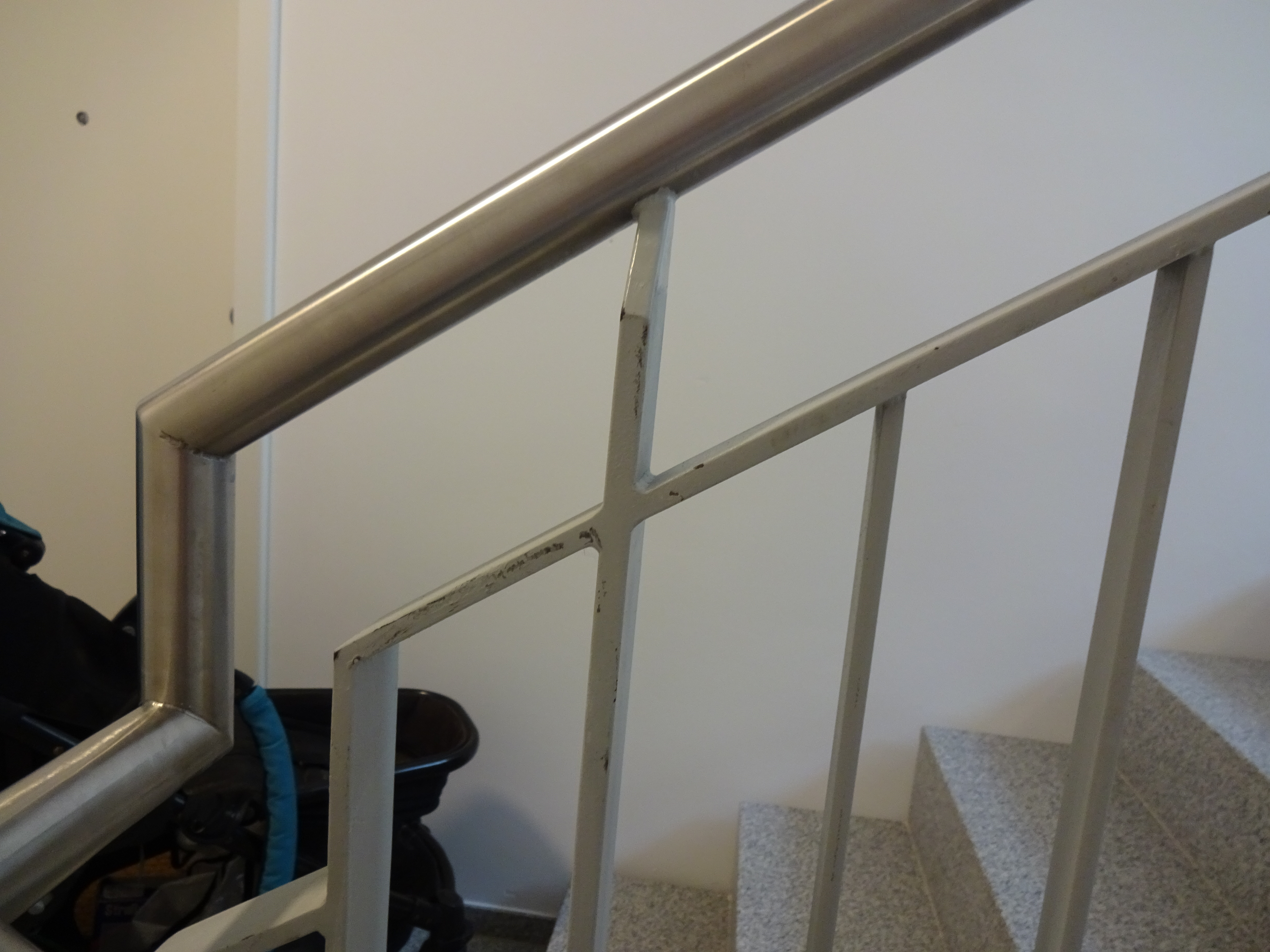 Bezug Zeile 214 Mängelliste - sehr oberflächlicher Versuch die Beschädigung des Bodens bzw. der Stufenkanten mit Aluschienen zu verdecken.