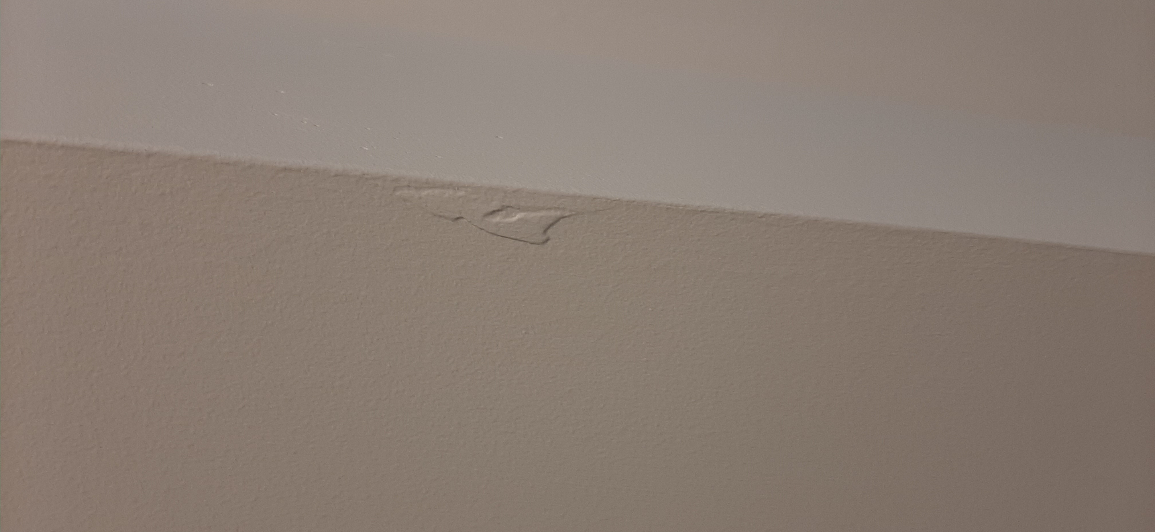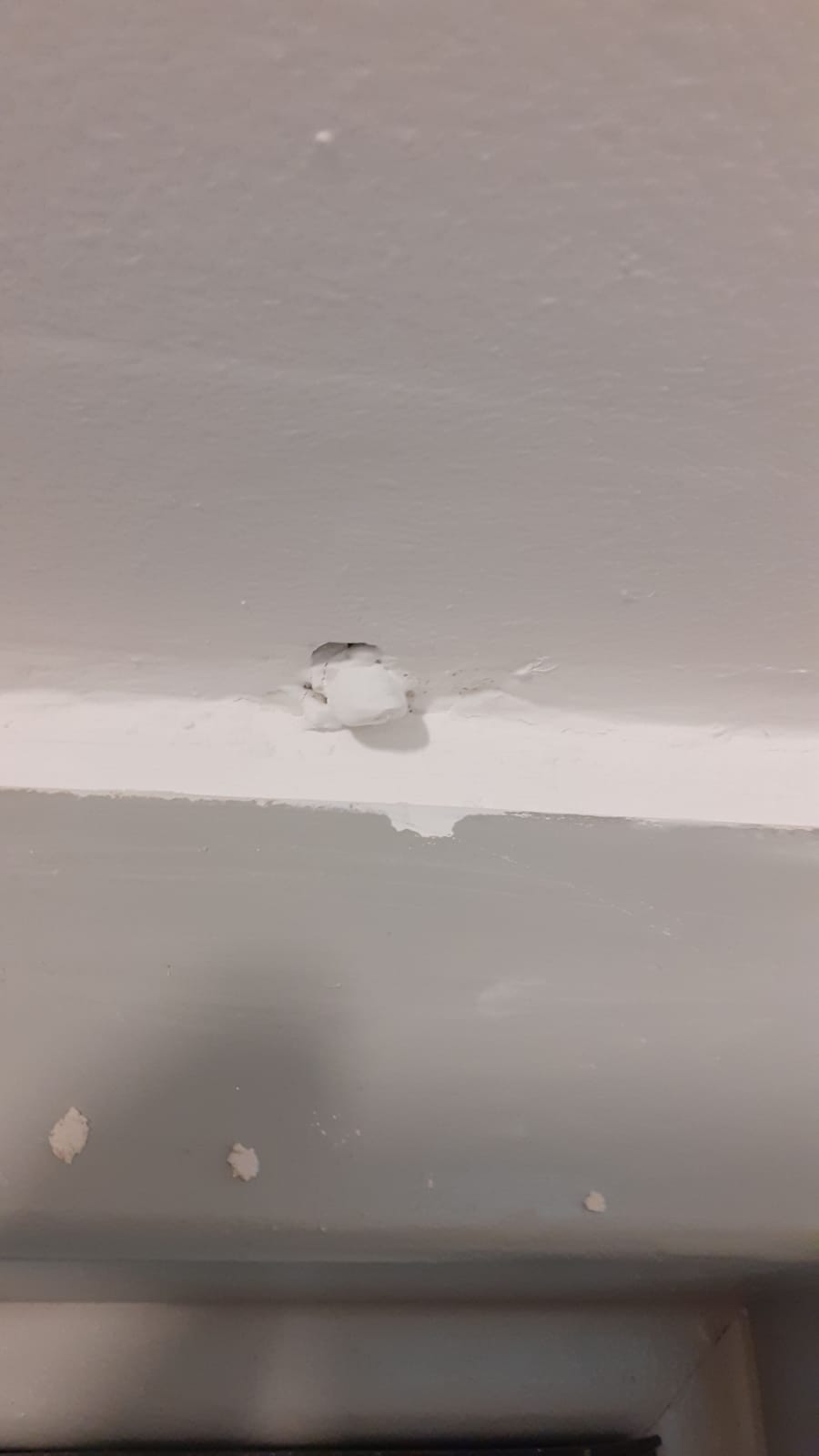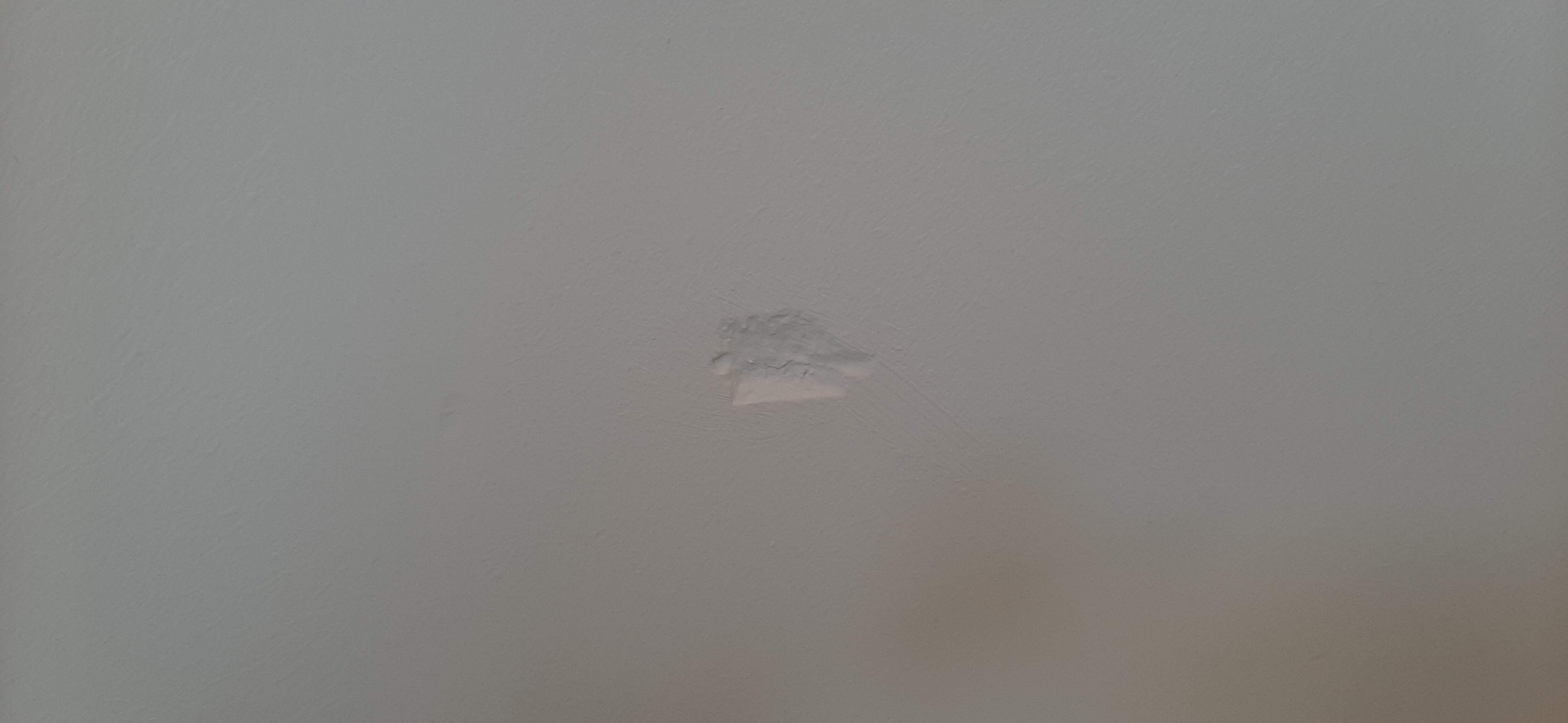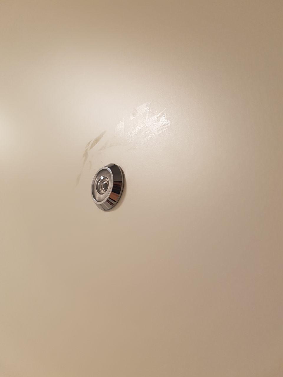 In frisch gestrichener Wand sind im Rahmen der Reinigungsarbeiten bereits zwei Stoßschäden dazu gekommen