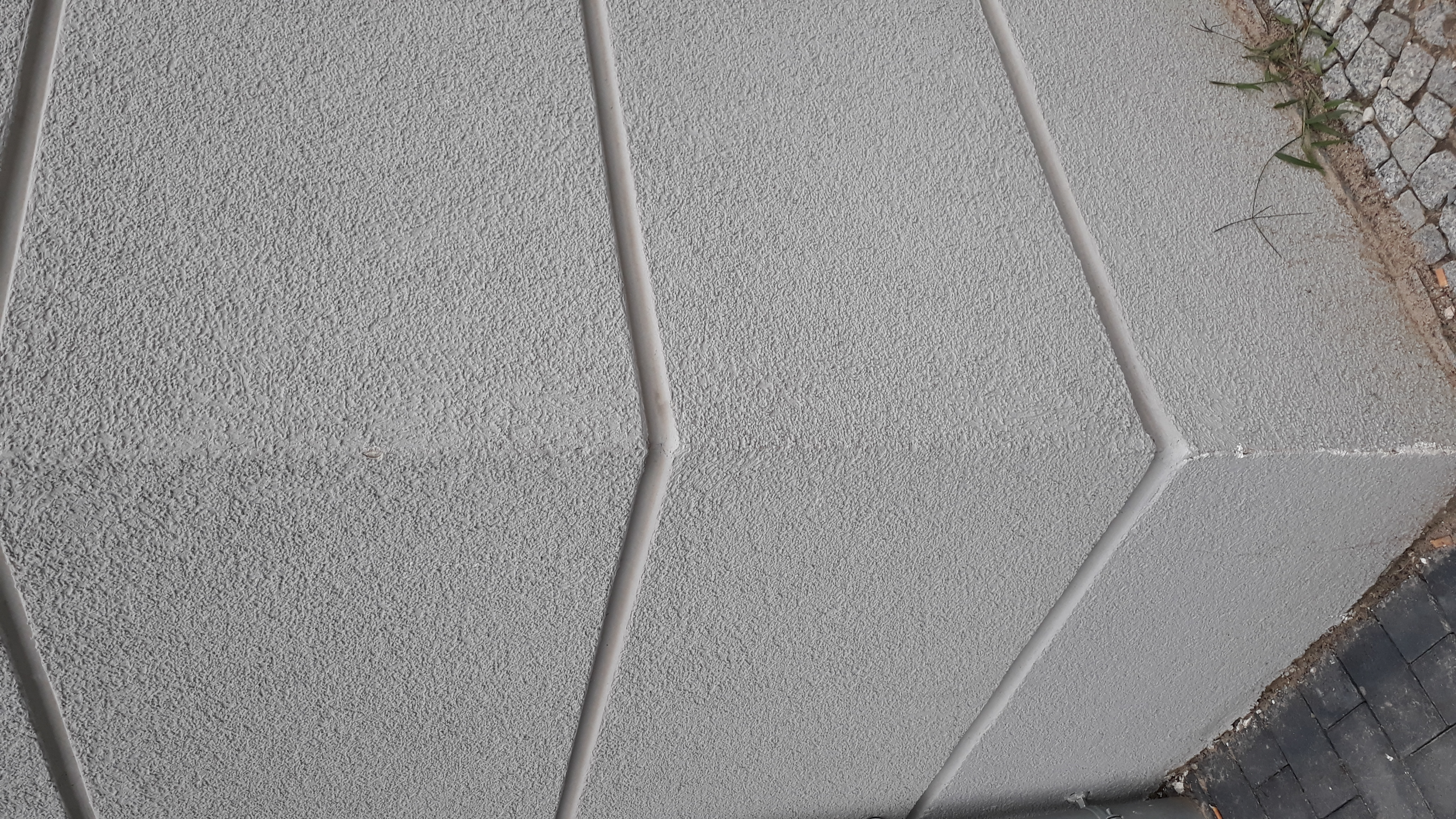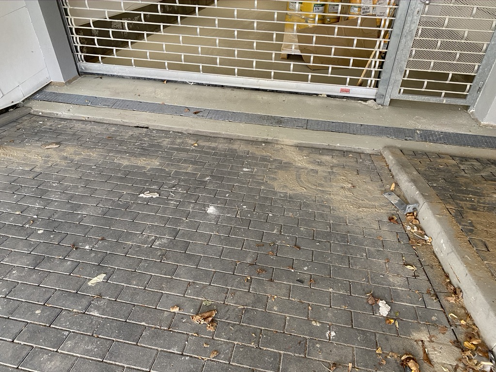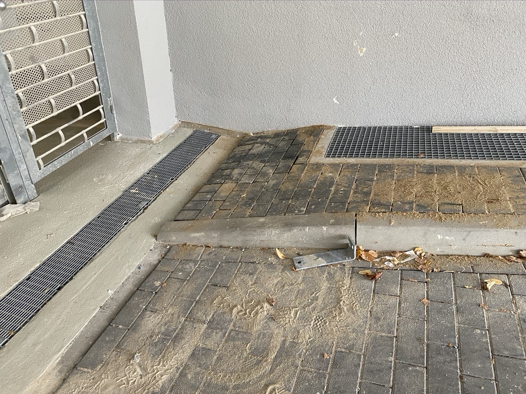 Betonsteine des öffentlichen Gehweges und Einfahrt zur Tiefgarage nicht Plan. Neuverlegung notwendig
