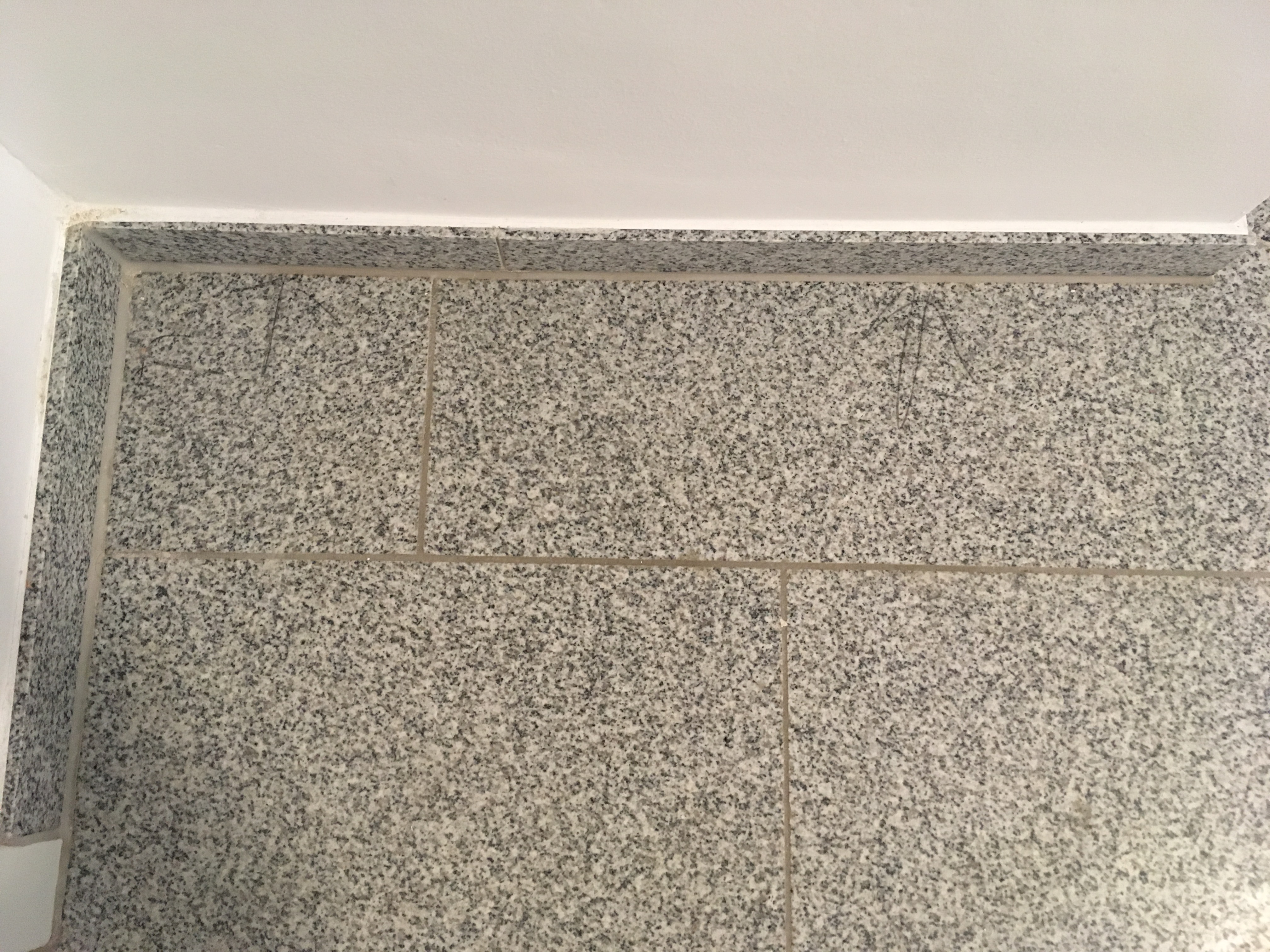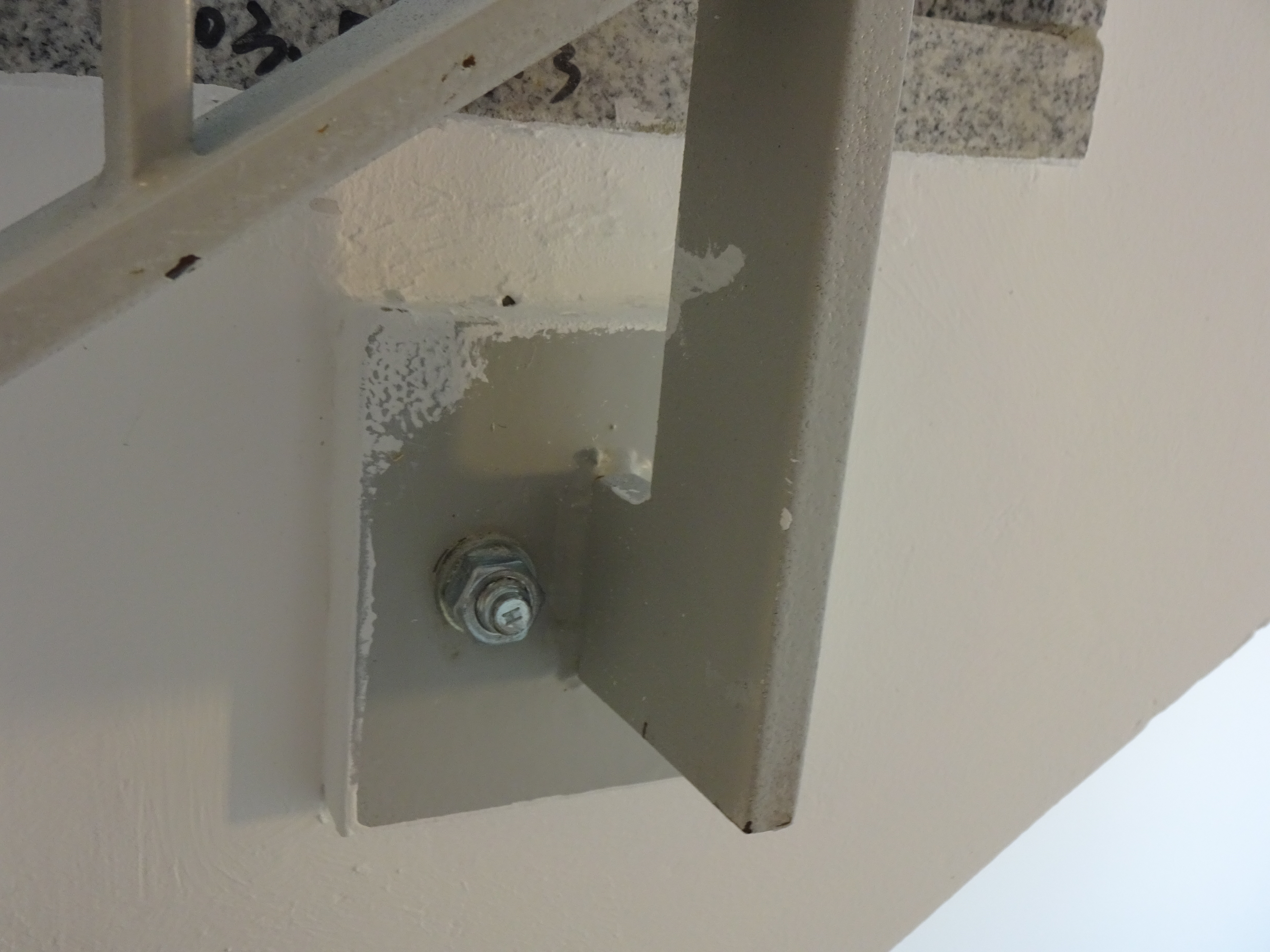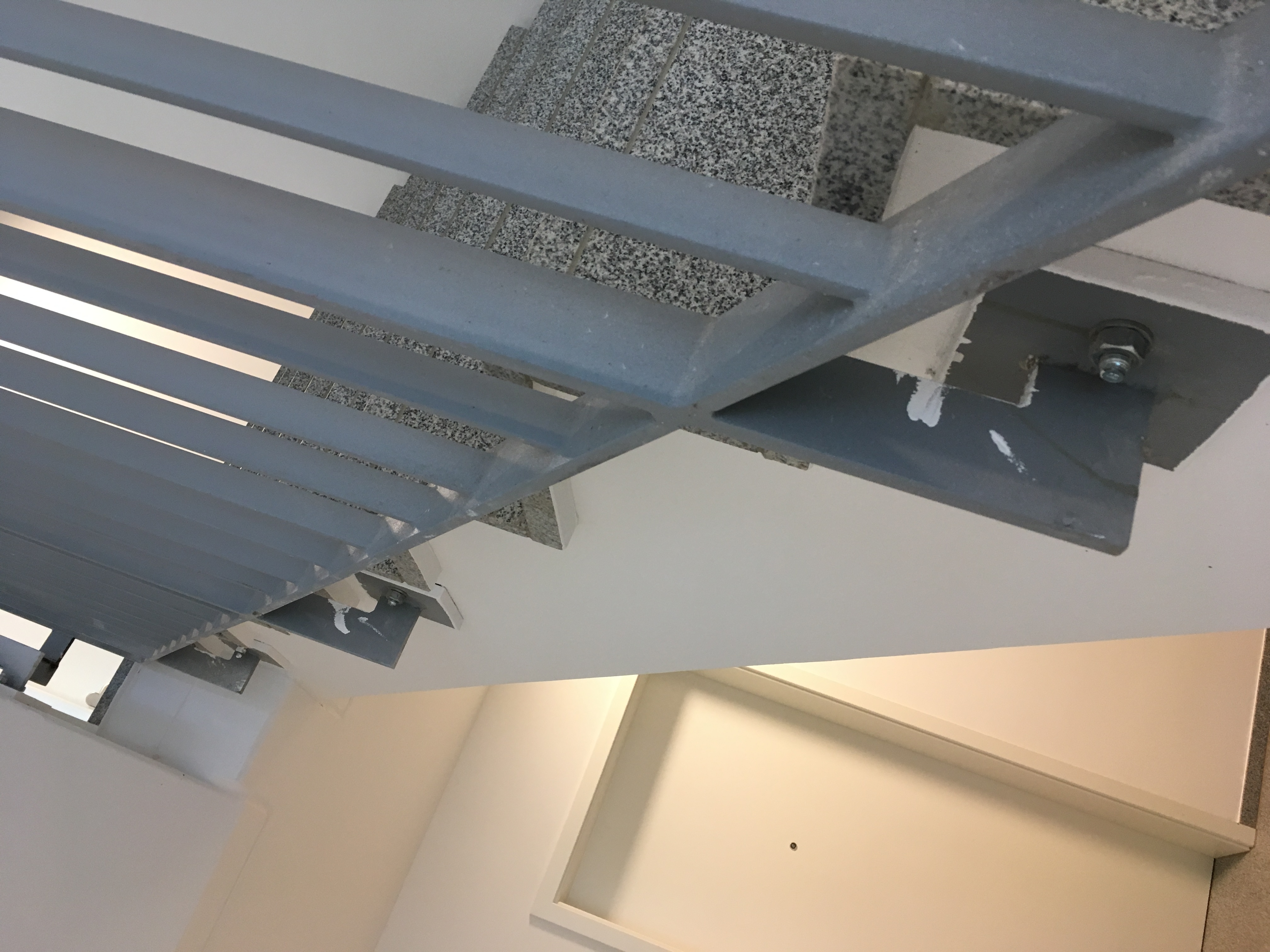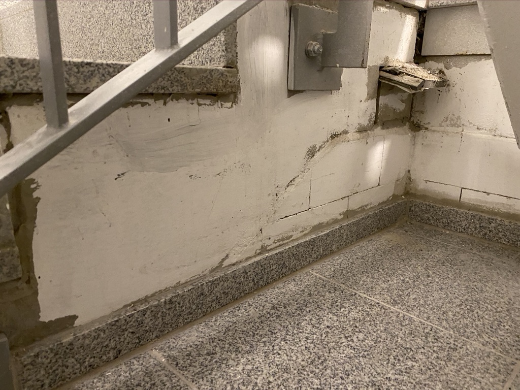 Prüfen ob Treppenfertigteile von Fußboden und Wand entkoppelt sind. Es darf keine starre Verbindung zwischen Treppe und Wand/Boden geben. Teilweise Fuge mit Mörtel verschmiert oder Granitstufen/Fußleisten in Kontakt mit Treppe
