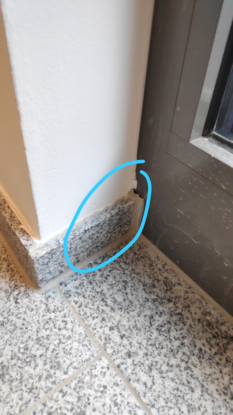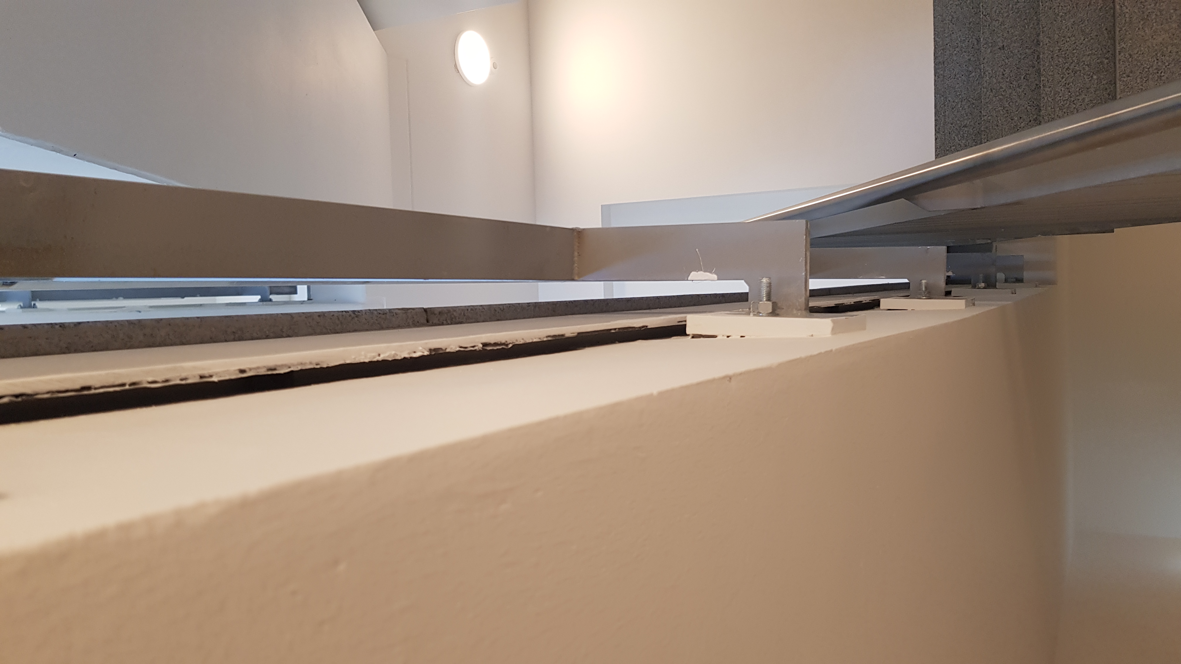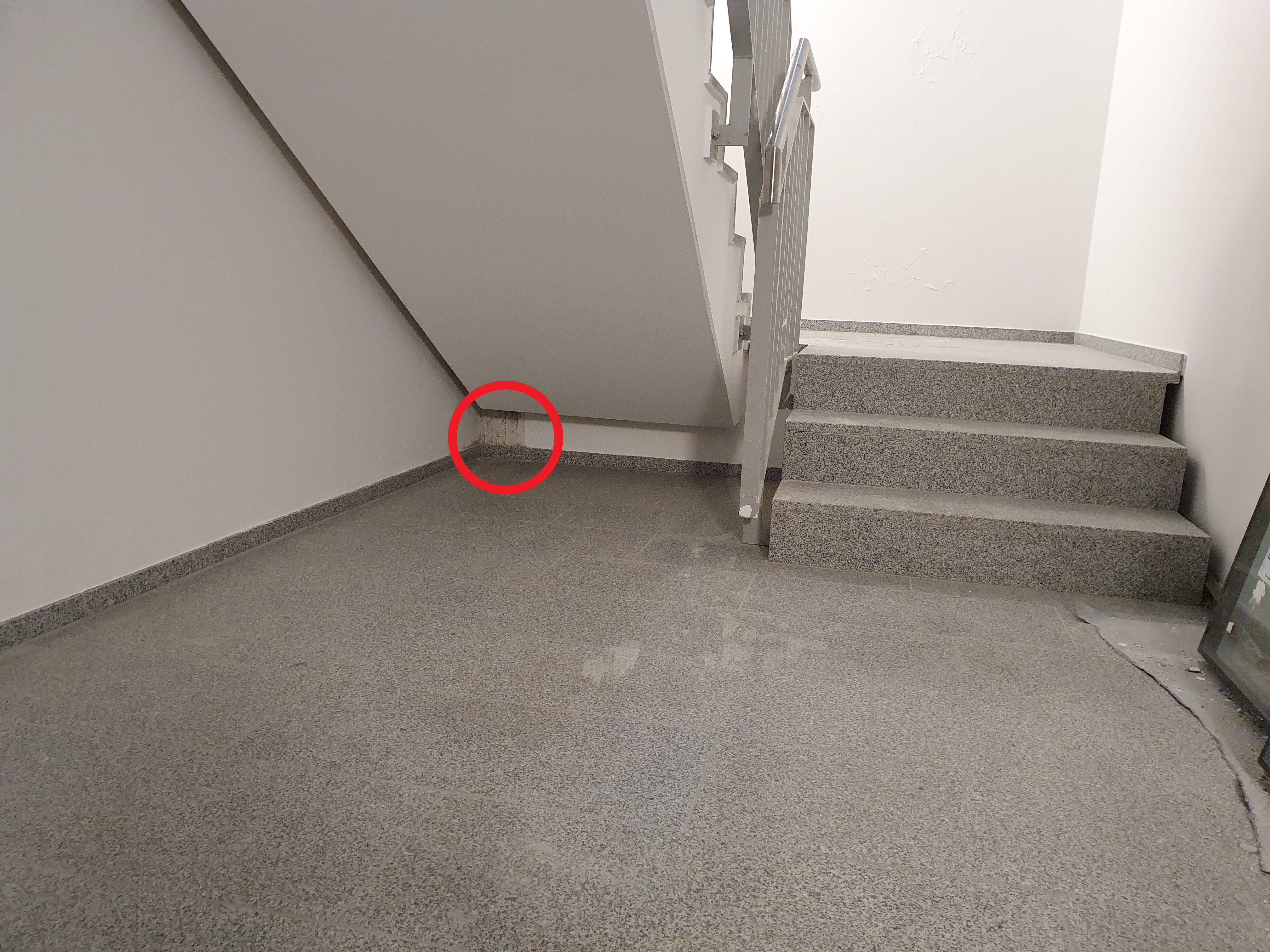 Prüfen ob Treppenfertigteile von Fußboden und Wand entkoppelt sind. Es darf keine starre Verbindung zwischen Treppe und Wand/Boden geben. Teilweise Fuge mit Mörtel verschmiert oder Granitstufen/Fußleisten in Kontakt mit Treppe