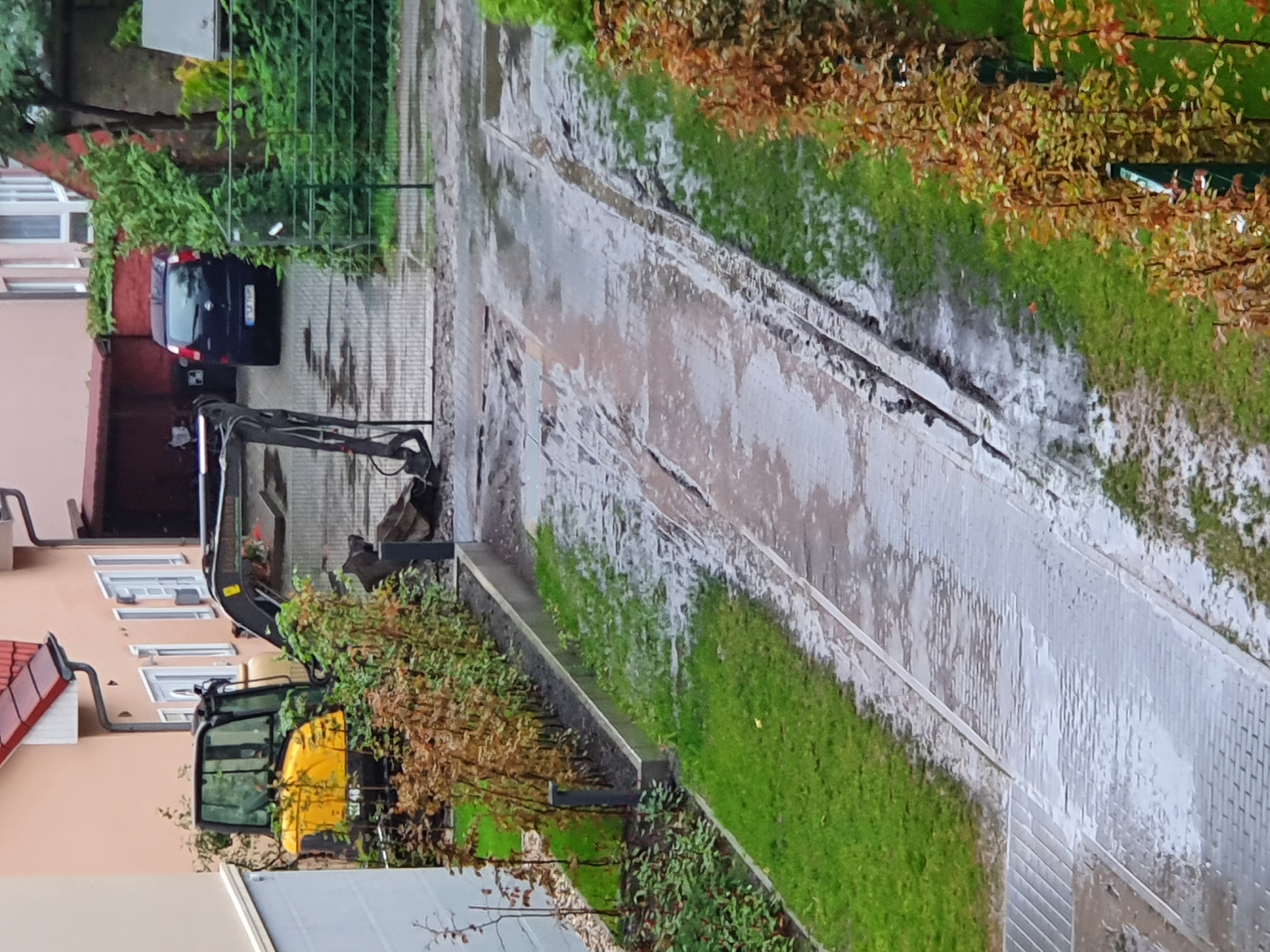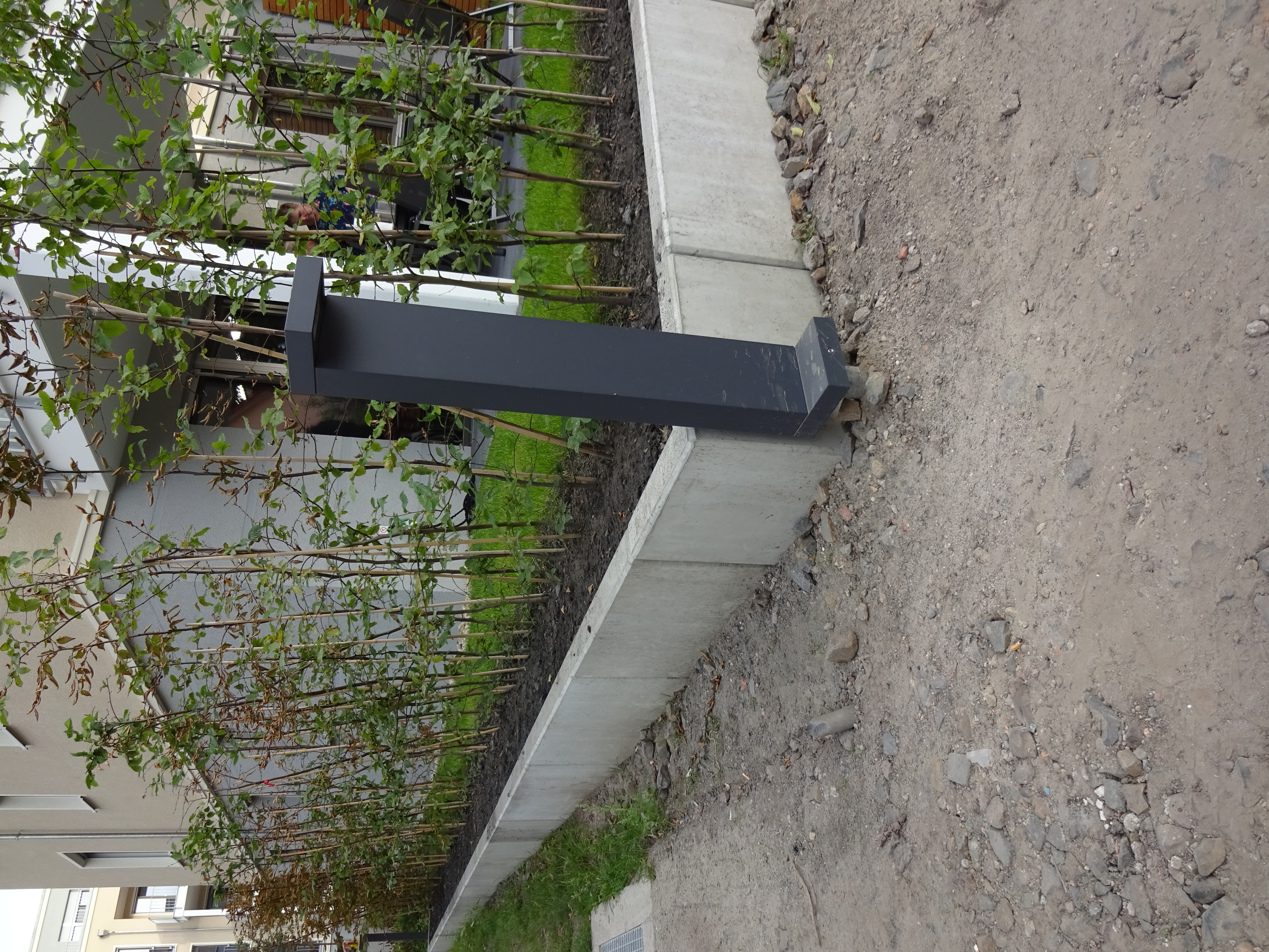 Hier muss m. E. einen abrutschsichere hohe Mauer vom Beet Richtung Rückwand Müllplatz geschaffen werden. Es besteht die Gefahr des Abrutschens des Beetes in den Müllraum bei Dauerregen