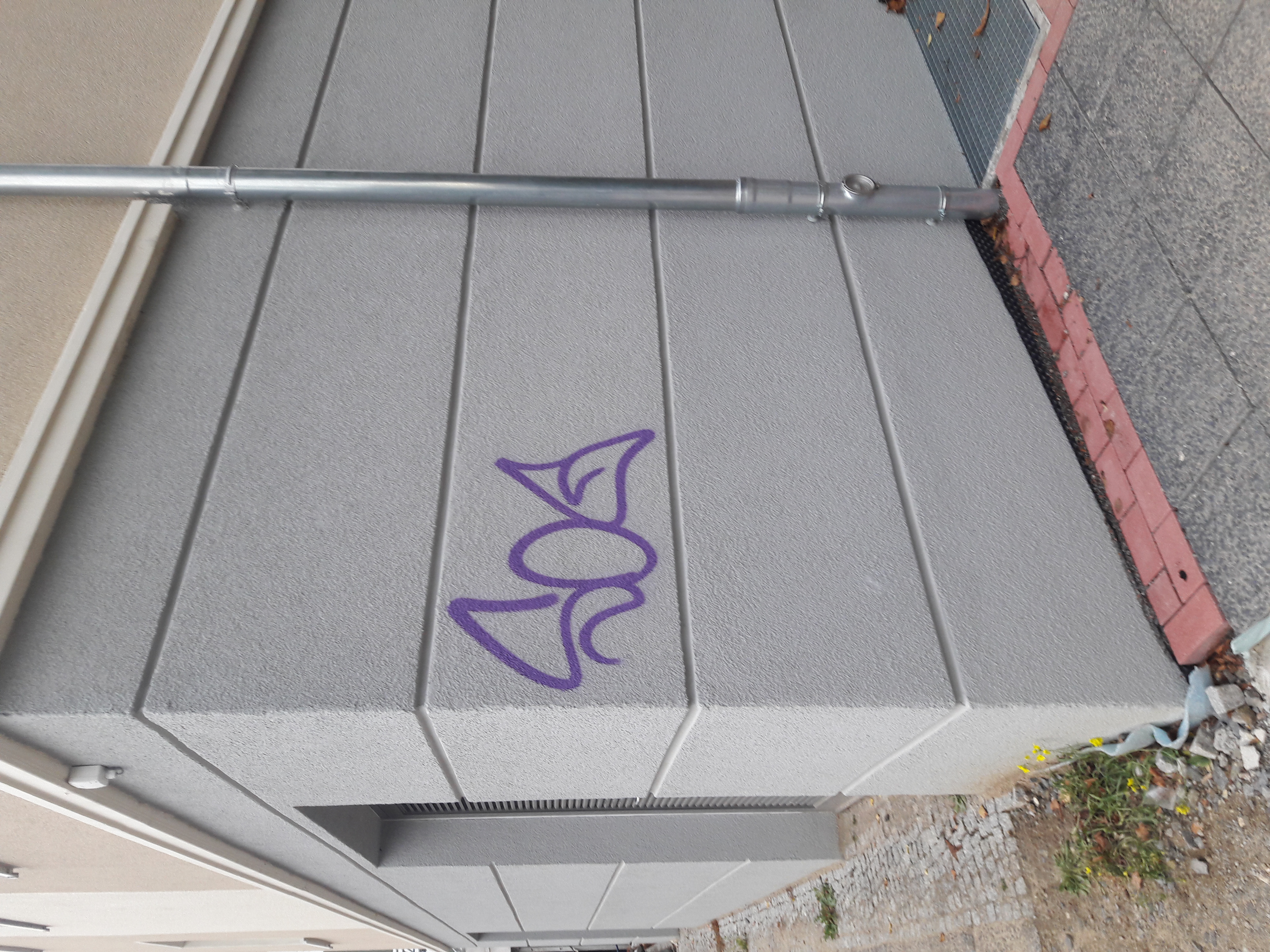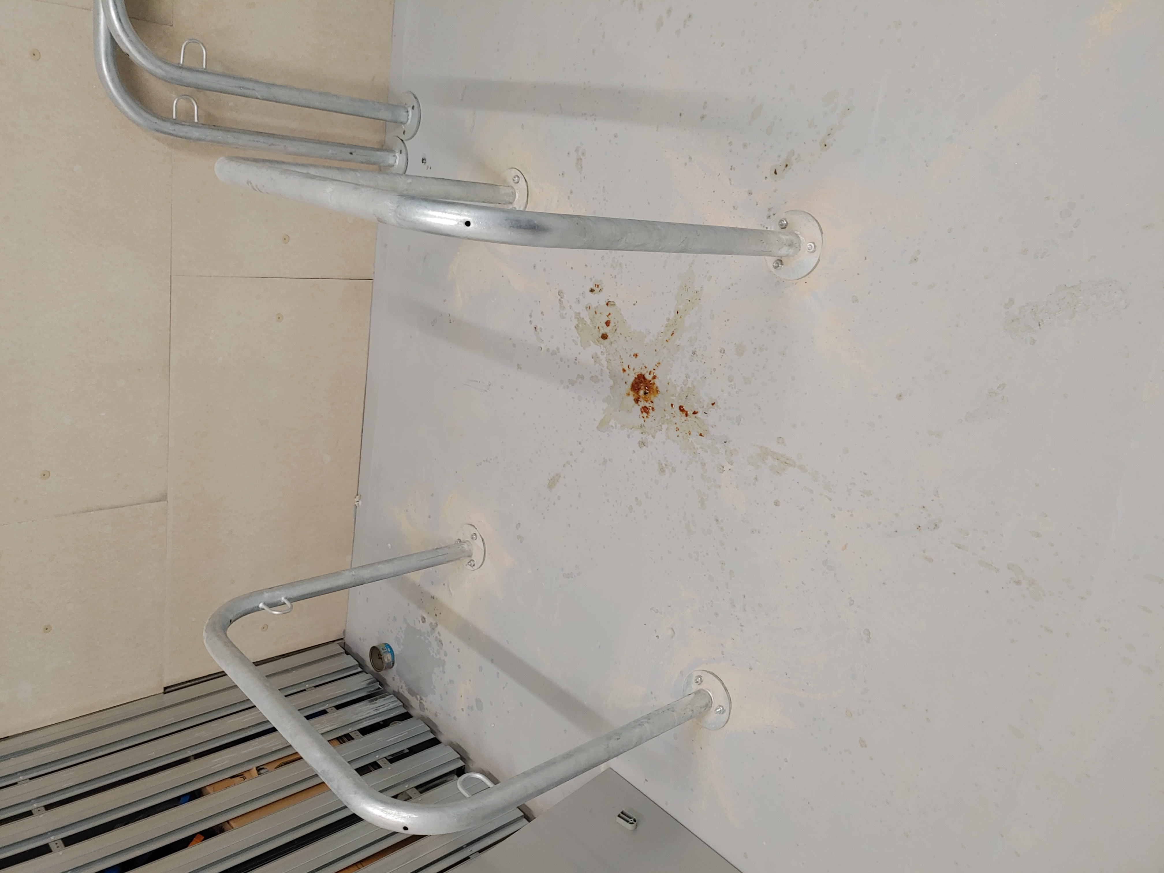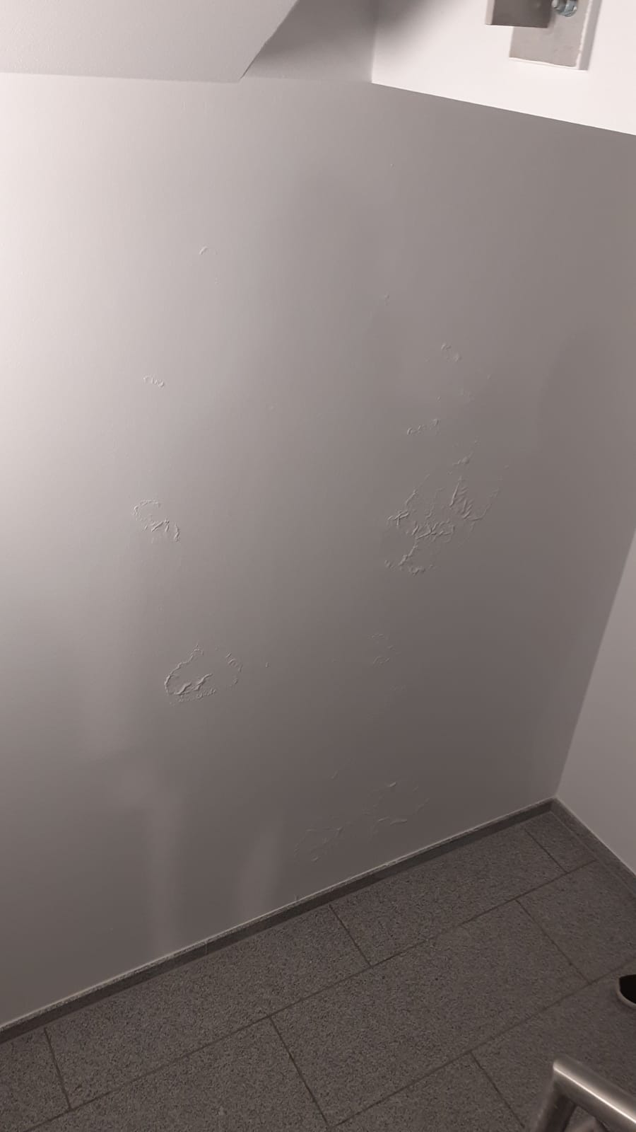 Diverse weiße Farbkleckse (sieht auf ersten Blick wie Vogelkot aus), unter anderem an Nordostecke bei Wohnung E01 (erstes Foto) aber auch an anderen Stellen (Foto 2 unter Wasserhahn an Ostseite).