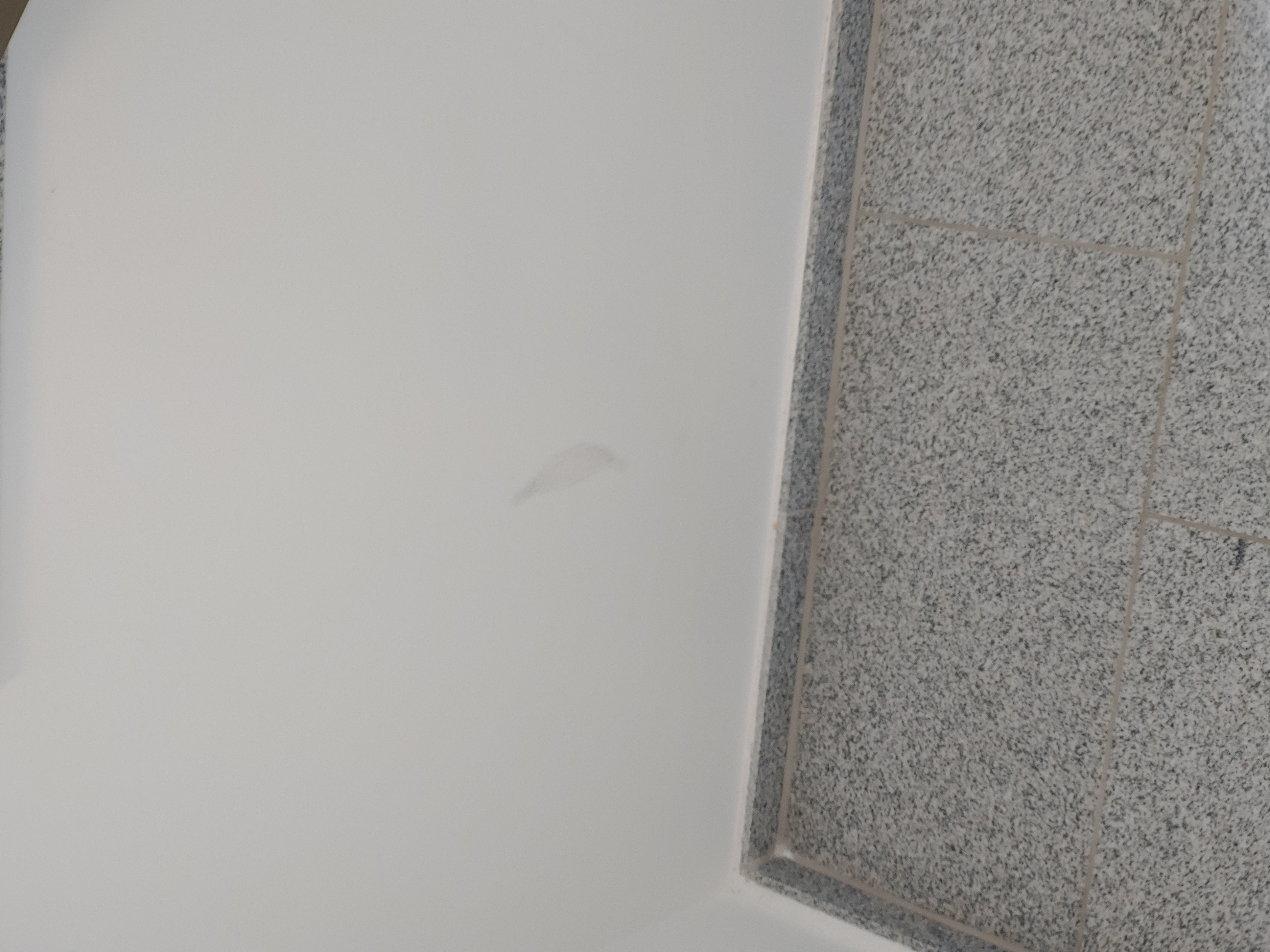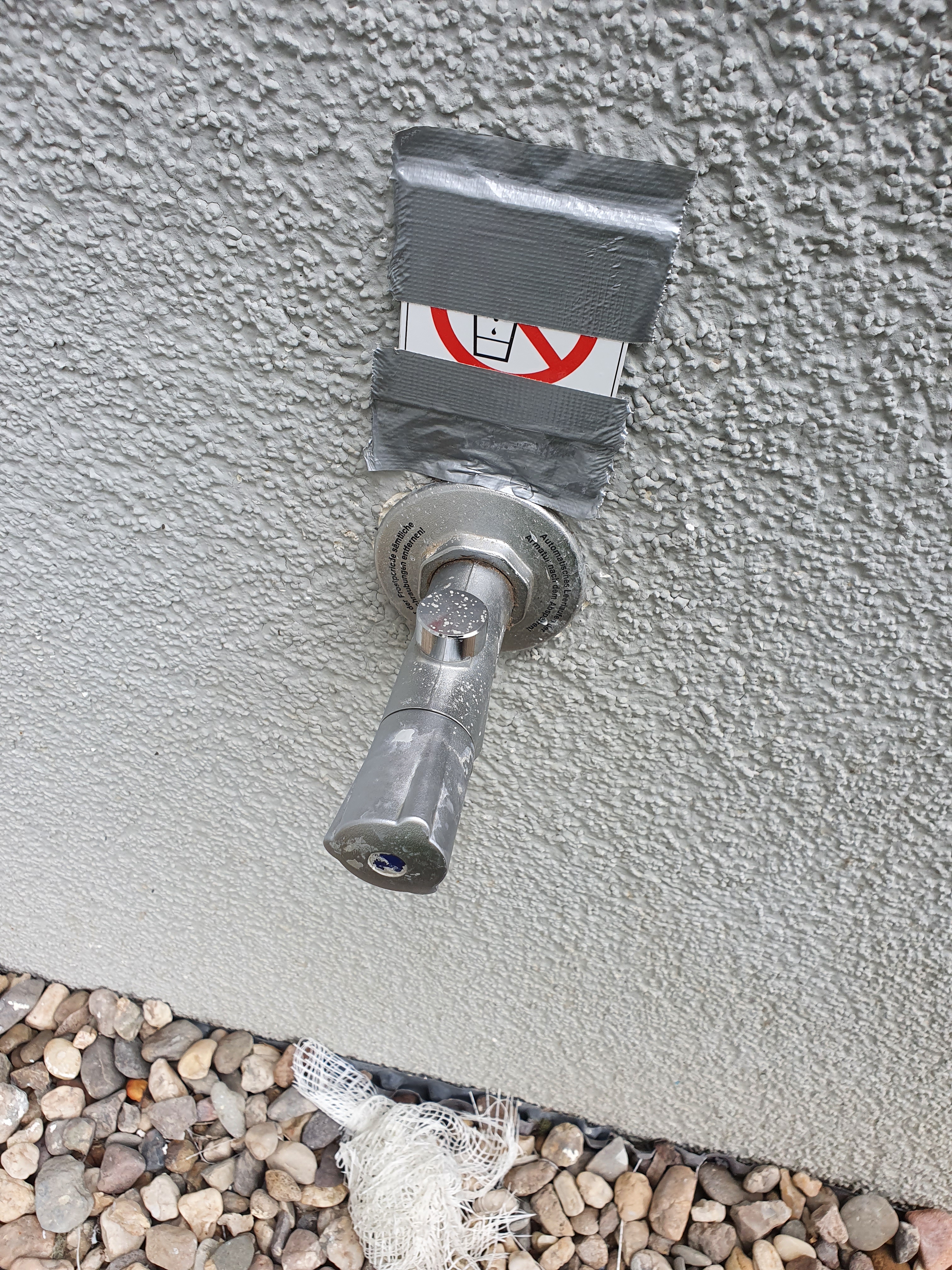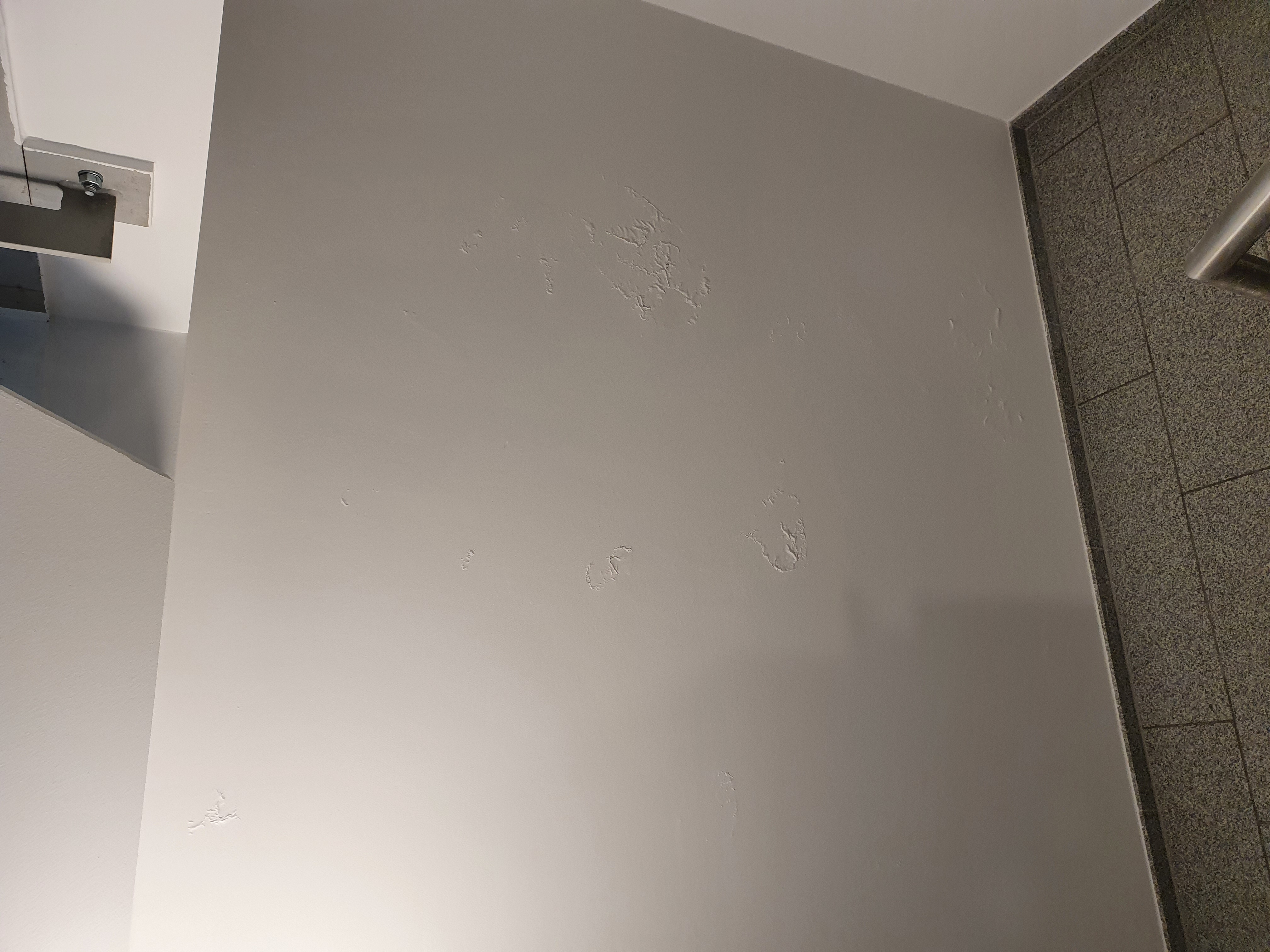 Diverse weiße Farbkleckse (sieht auf ersten Blick wie Vogelkot aus), unter anderem an Nordostecke bei Wohnung E01 (erstes Foto) aber auch an anderen Stellen (Foto 2 unter Wasserhahn an Ostseite).