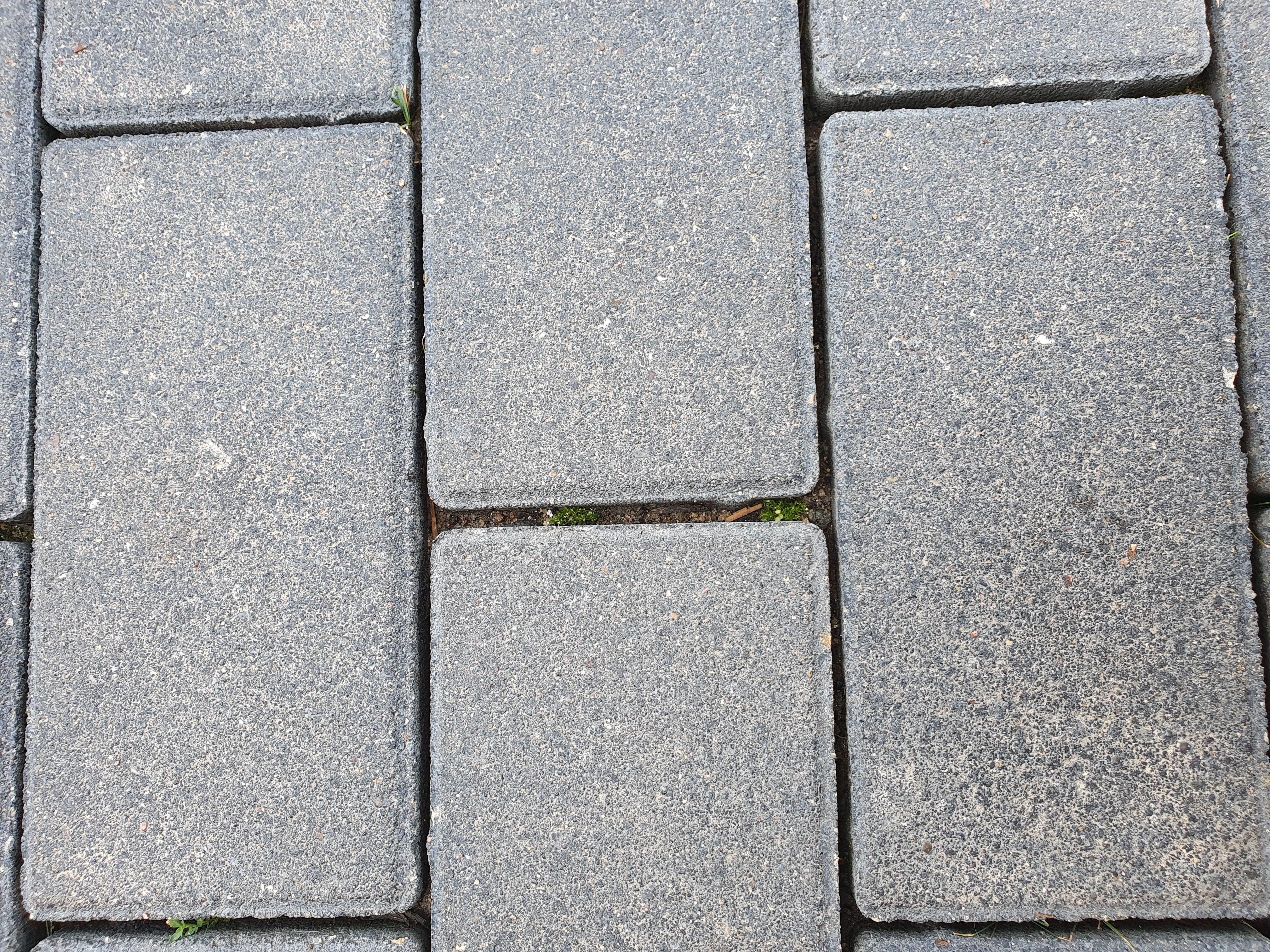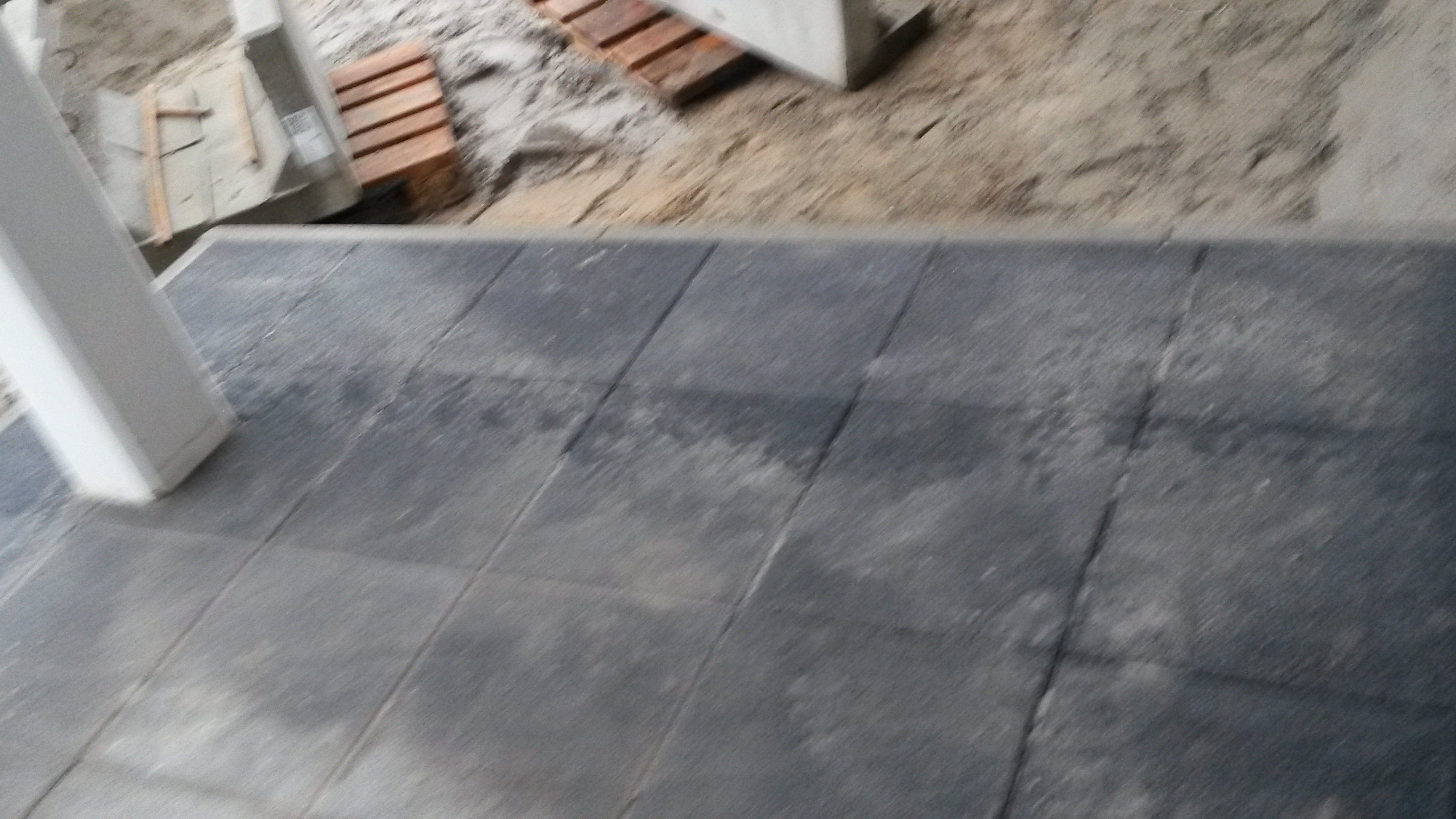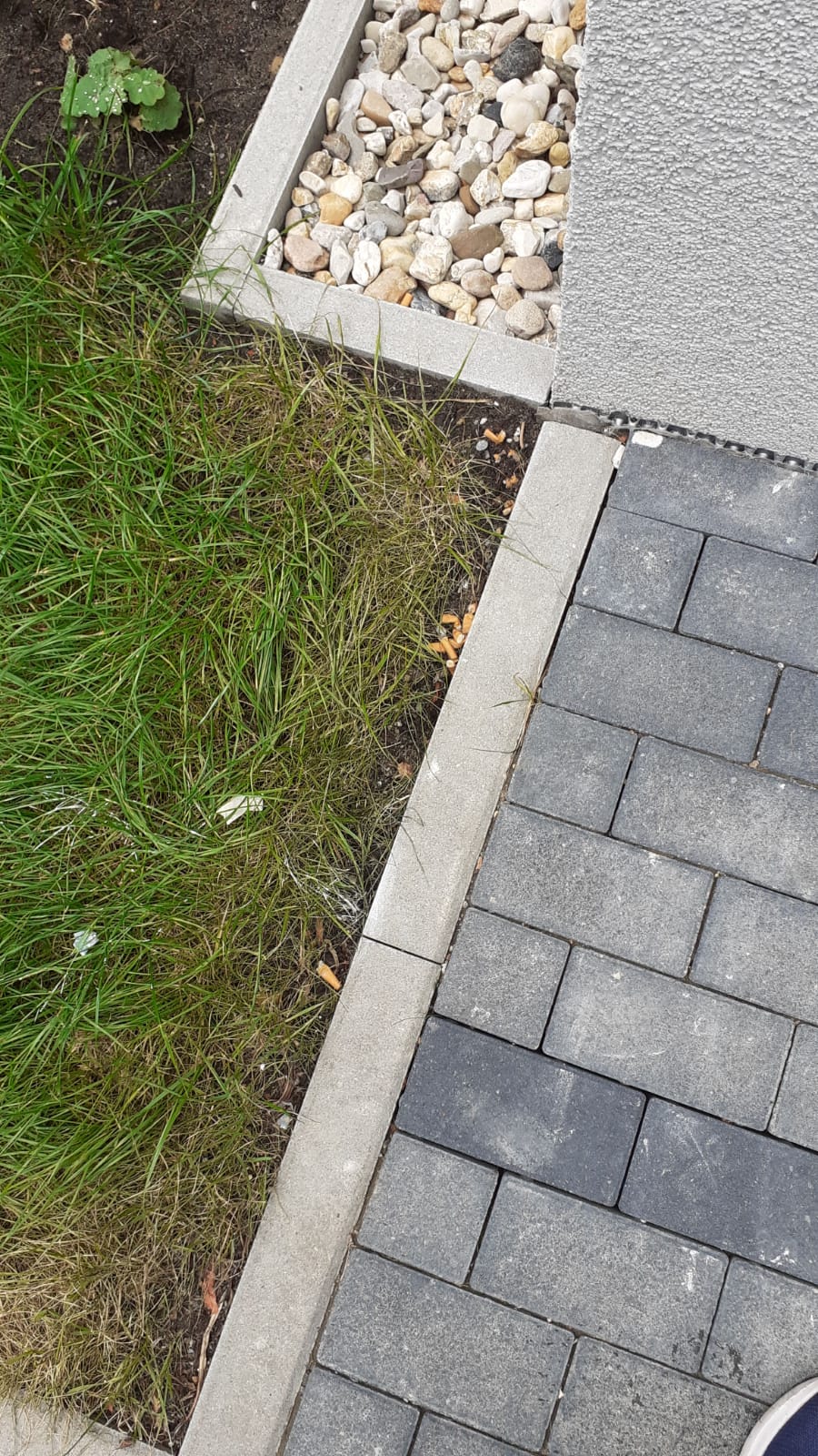 Betonrechtecksteine müssen eingerüttelt werden, Auftritt höher als Rastersockel, zudem uneben verlegt