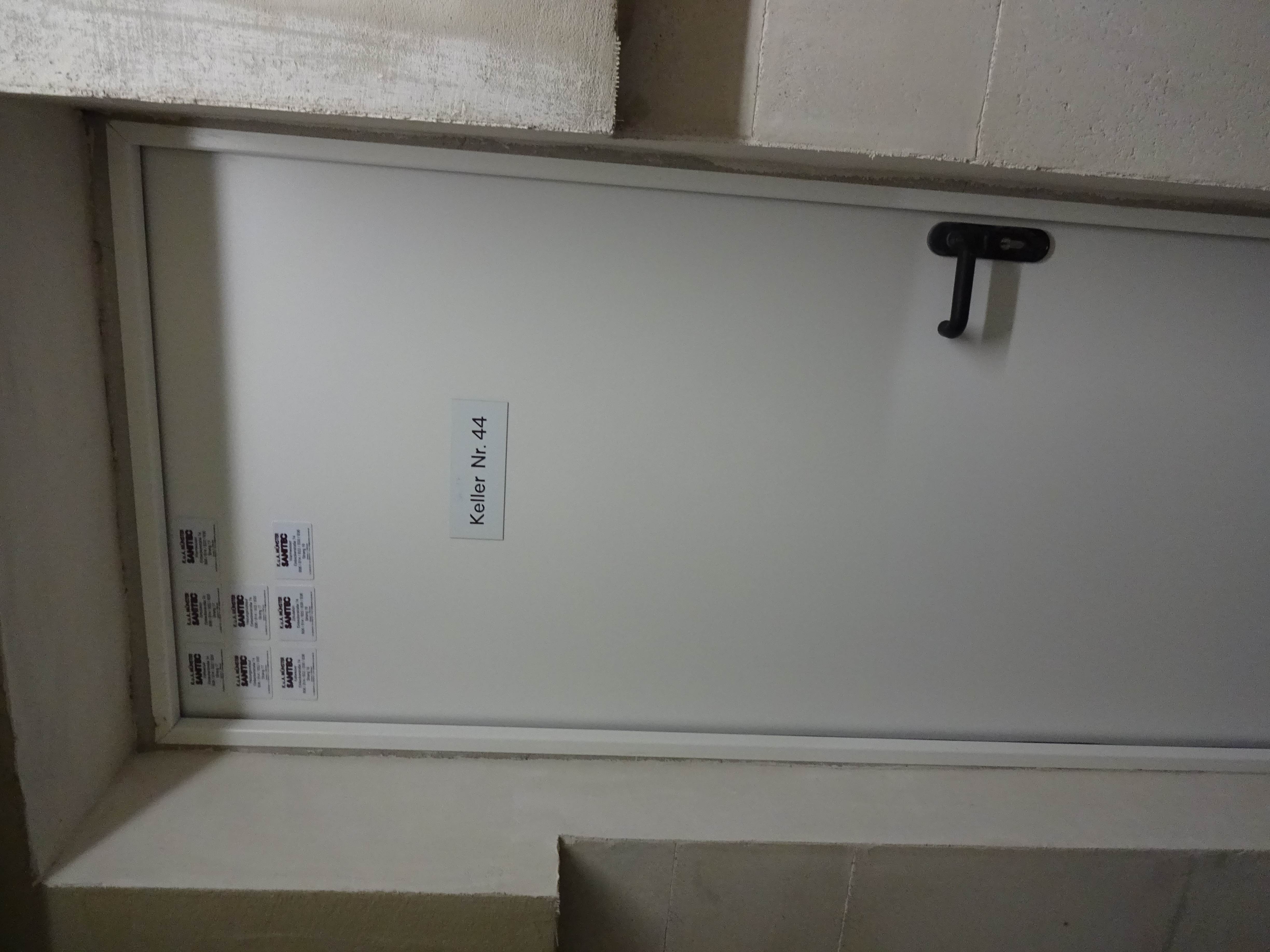 Lüftungskonzept - Sackgasse in Richtung Fahrradraum (Abschluss mit Fenstern statt Gitter)? Fahrradraum ist nicht zum TG Stellplatz abgetrennt (Gitter notwendig wegen Durchlüftung) und das Schild Fahrräder ist hier irreführend, da dort ein Auto stehen soll (Zugang zum Fahrradraum ist links). Bleibt der Fahhradraum leer oder kommen hier noch Bügel zum Anschließen der Räder? Durch die Fenster ist bereits Wasser eingetreten, Schächte verschmutzt.