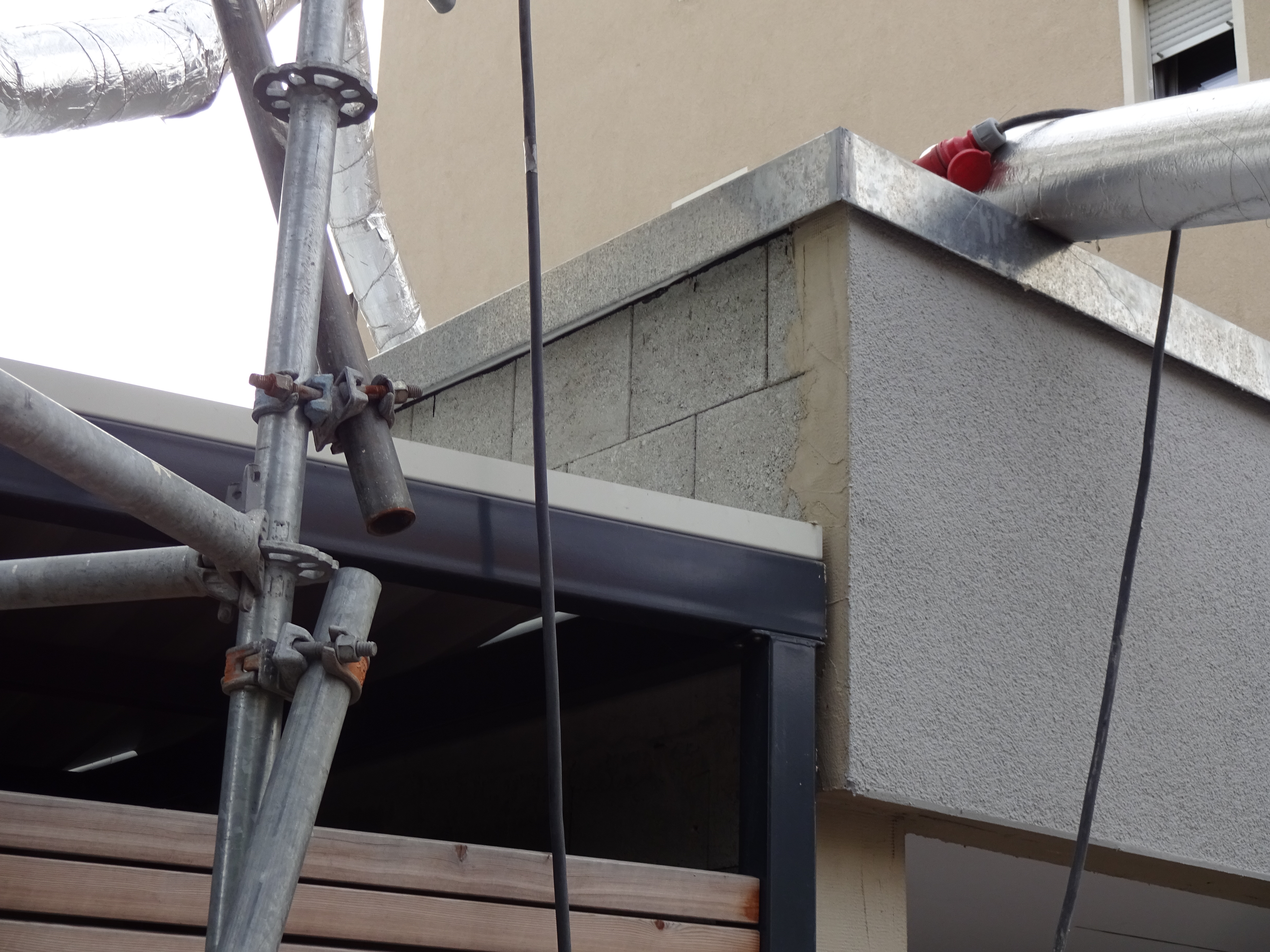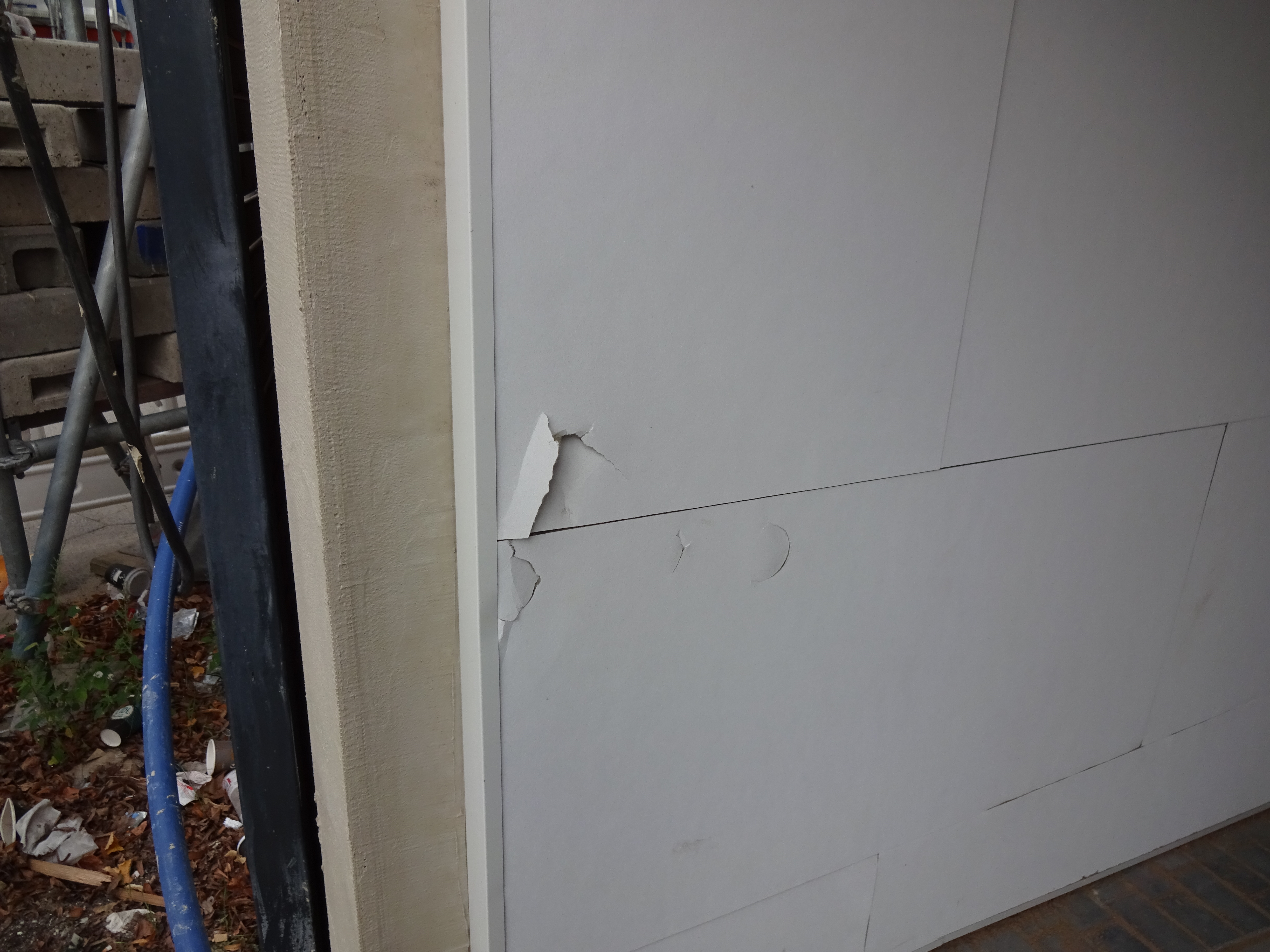 Die Dämmplatten an der Einfahrt der Tiefgarage weisen bereits ausgebrochene/gerissene Stellen auf.