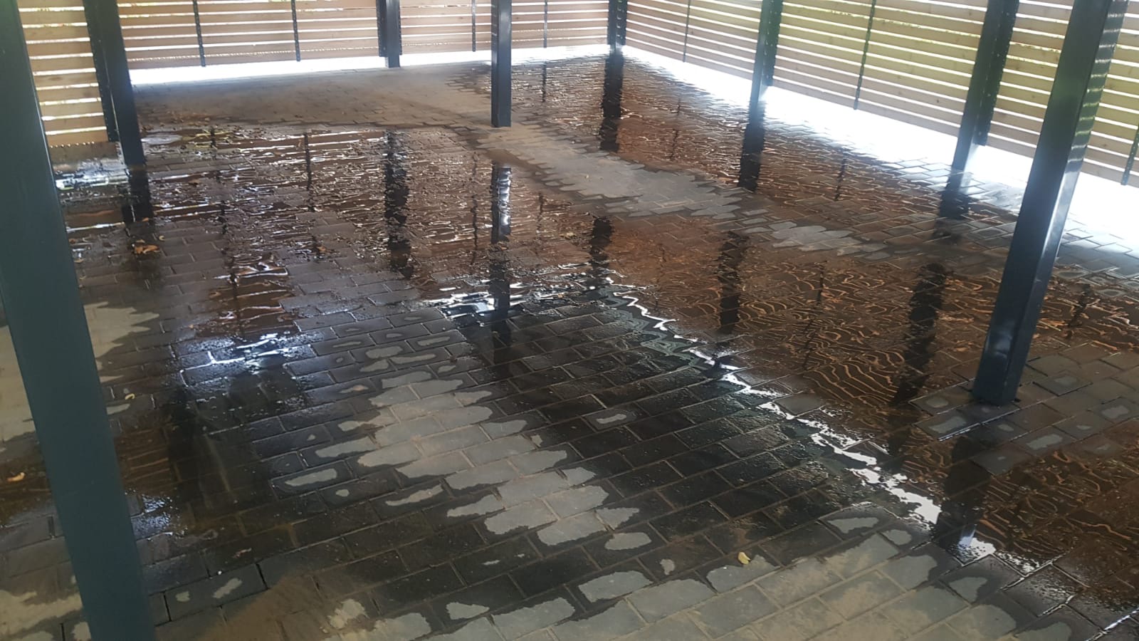 Bei Starkregen, läuft der Lichtschacht (1. rechts von D aus) über und Wasser läuft in die Tiefgarage