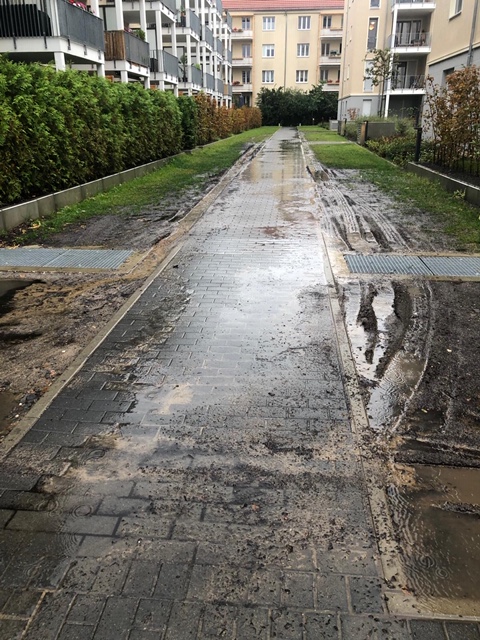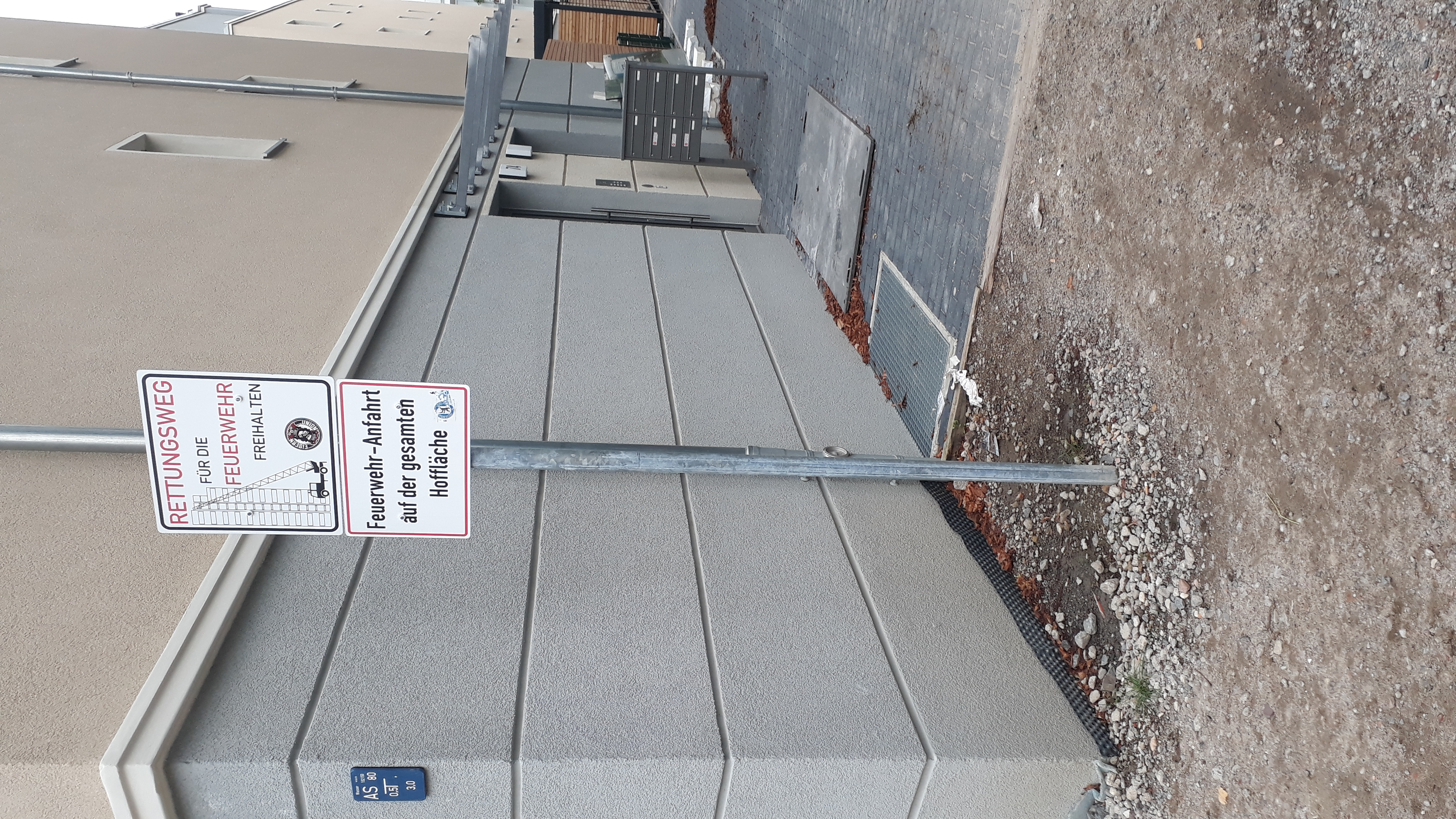 Dachentwässerung entwässert öffentlich auf den Gehweg, Neigung der Achsen laufen zum Ixel der rechten Außenwand des Müllraumes zu, sodass sich die Wassermassen an der Ecke der Zuwegung am Haus B treffen - Keine Mulde vorhanden - Wasserstau