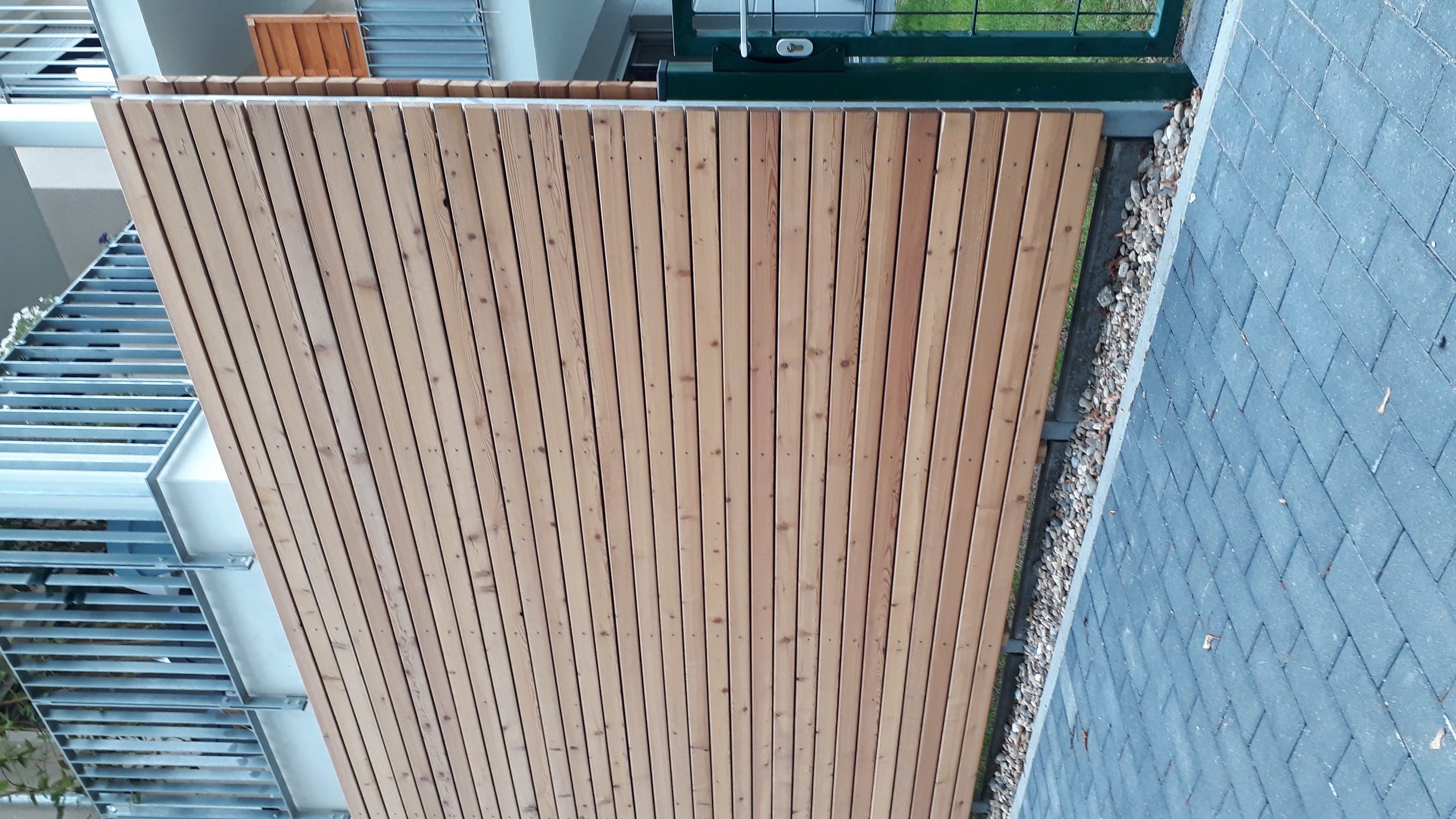 Holzsichtschutz ist durch übergelaufenes Regenwasser der Dachentwässerung verunreinigt