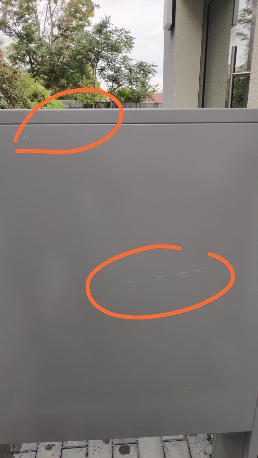 Gemäß Baubeschreibung unter Nr. 21 werden die Briefkästen mit Regenschutz montiert, sofern sie freistehend sind. Dies ist beim Briefkasten zu Hausnummer 76 nicht der Fall. Das Glasdach vom Hauseingang deckt den Briefkasten nicht ab. Sofern es geregnet hat, fließt das Wasser auch vom Briefkasten nicht ab, sondern bleibt stehen und muss verdunsten.
