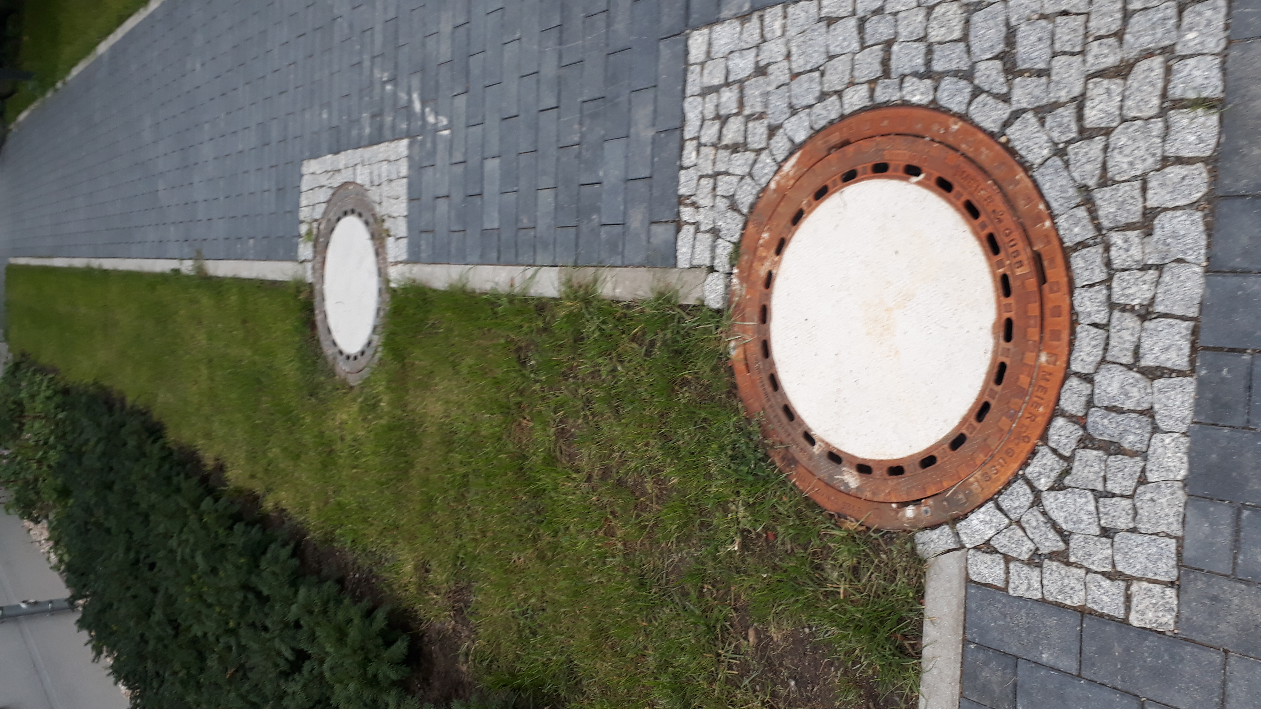 Es gibt unterschiedliche Ausführungen der Pflaster um die großen Schachtdeckel. Um einen Schachtdeckel sind die normalen Pflastersteine geschnitten um einen anderen Schachtdeckel ist Kopftseinpflaster.