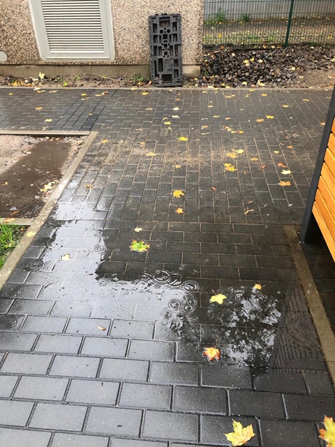 Fehlende Abflussmöglichkeit für Regenwasser, sodass sich bei Regen stets eine große Pfütze bildet und die Feuchtigkeit Rückstände an der Hauswand Haus A bildet
