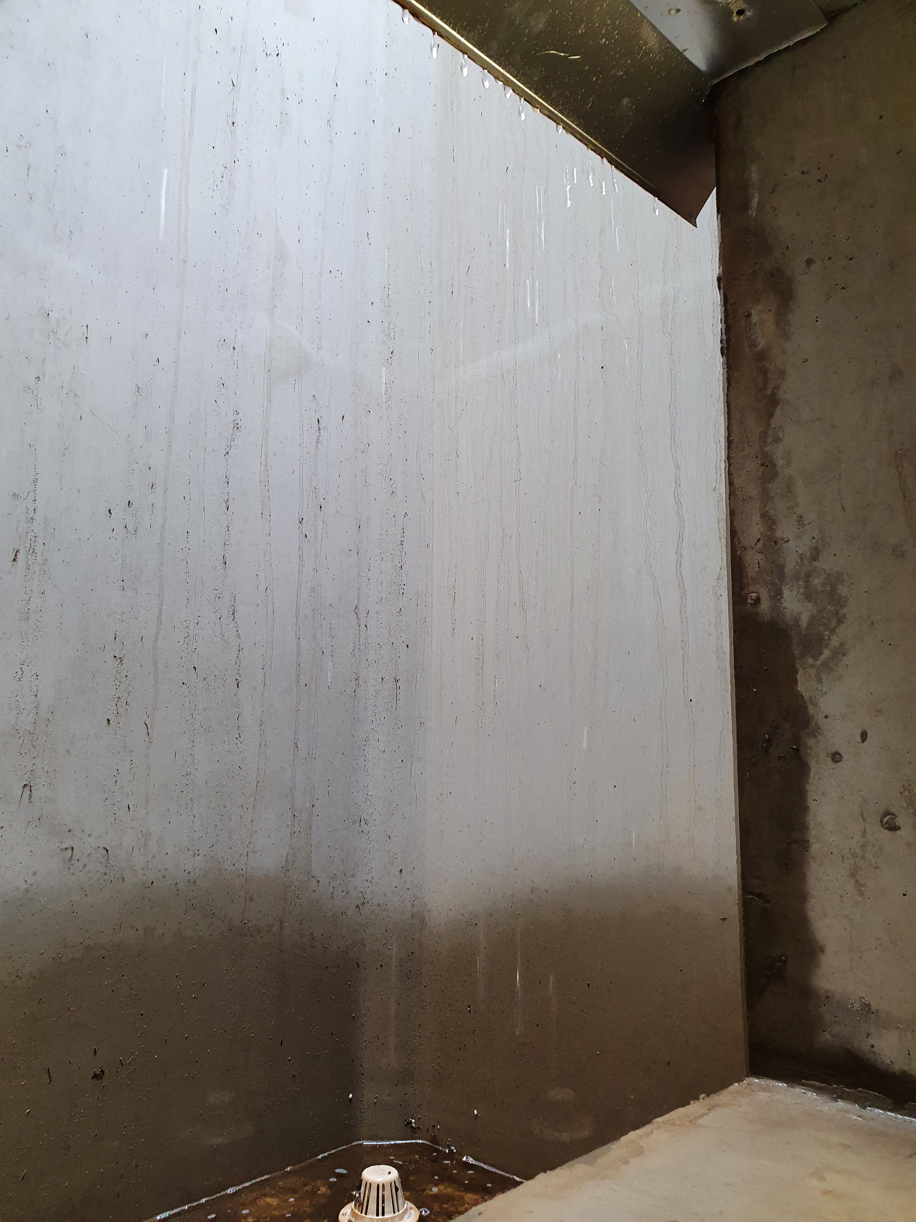 Tiefgaragenschächte stark beschädigt. Schichtenwasser dringt durch die Fertigteile ein - teilweise versottet schon, zudem fehlt das Gitter zum Ablauf an der Sohle - Schächte zw. Haus B und Haus C
