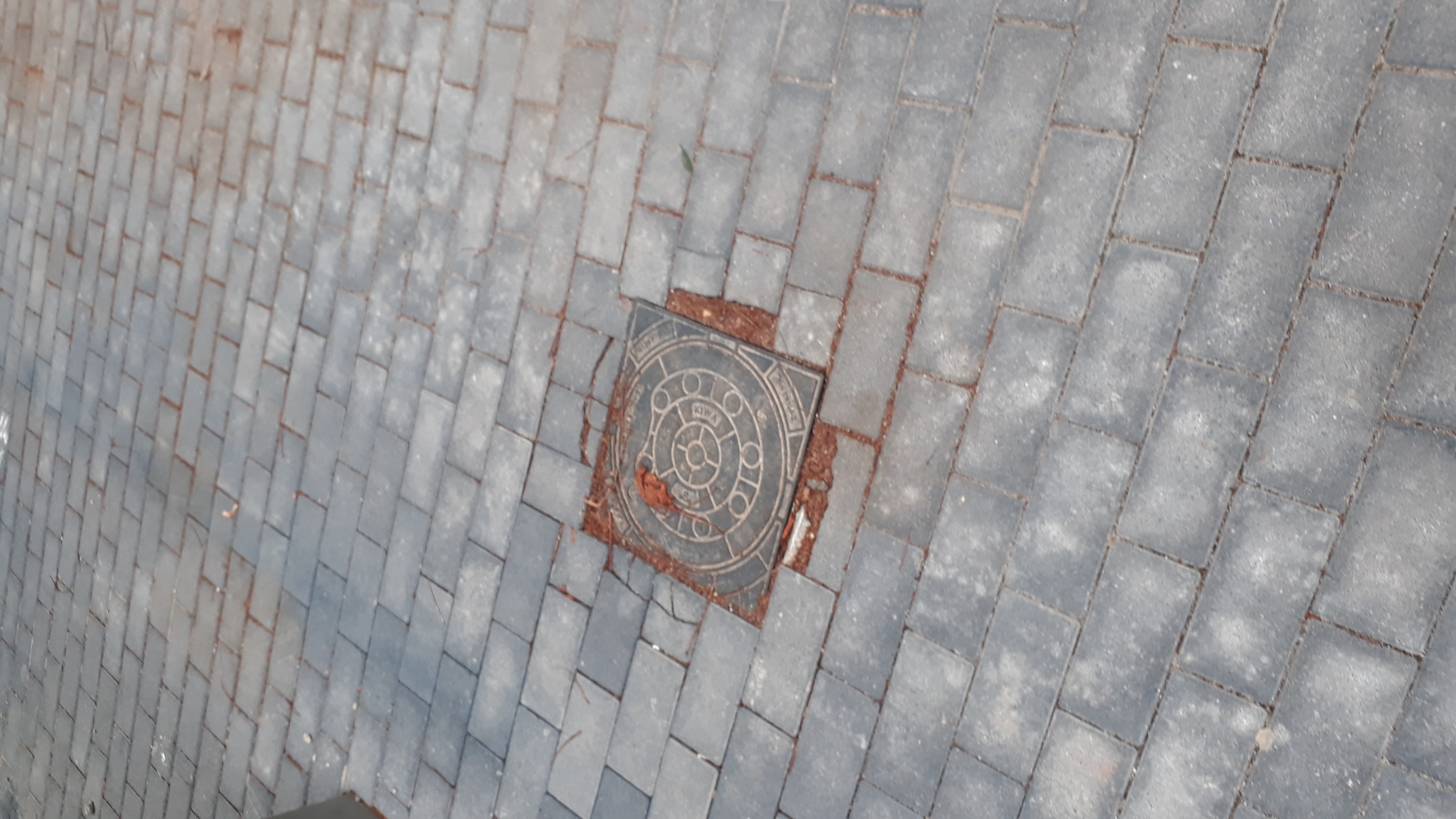 Um einen Schachtdeckel (für Hydrant) vor Haus A sind die Pflastersteine bereits gebrochen.