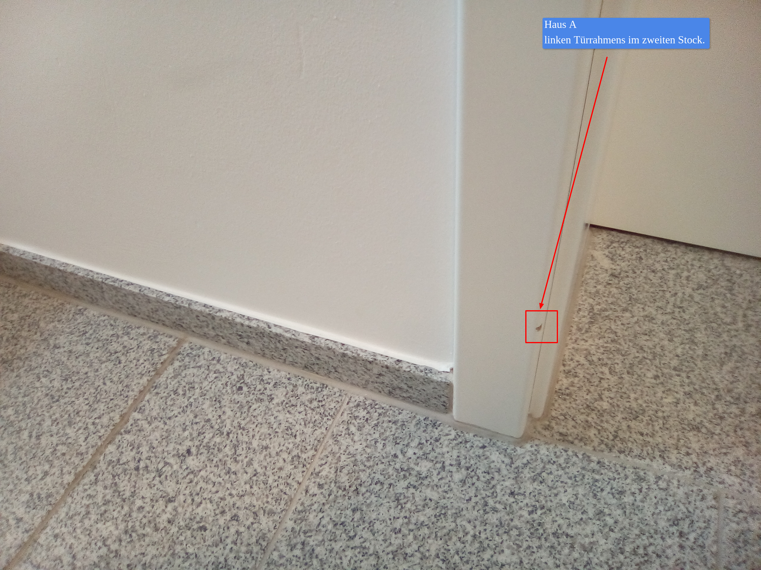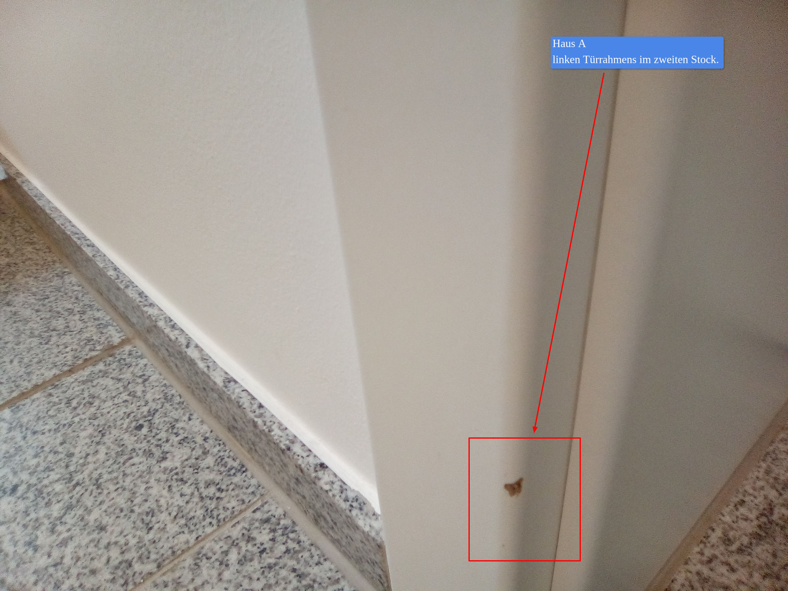 Am Eingangsbereich von Hnr. 76 sind zwei Fehlstellen Putz auszubessern (einmal rechts unten im Türbereich und einmal links von der Tür etwas höher in der Ecke)