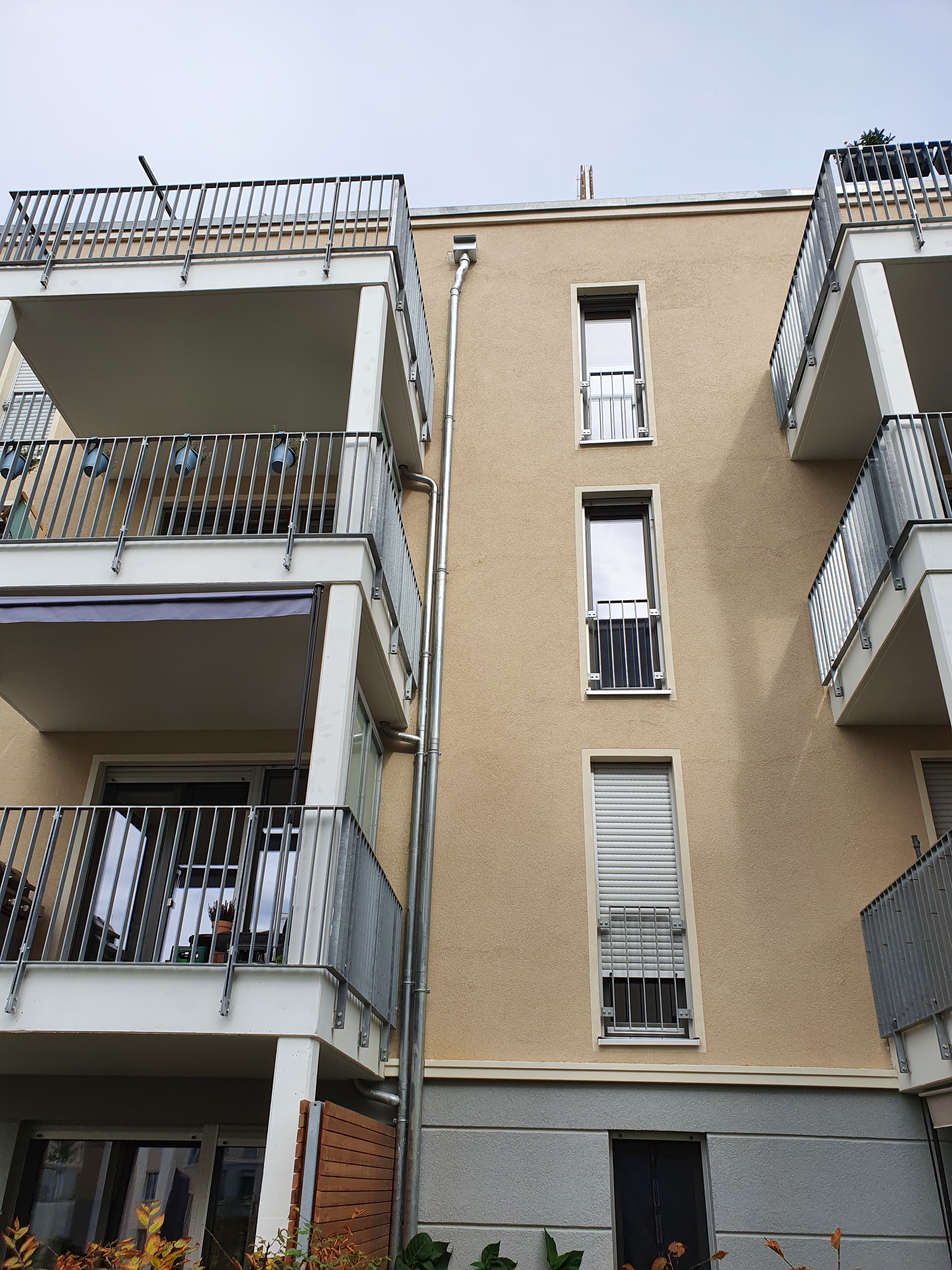 Die Regenrinnen sind teilweise nicht richtig befestigt, manche Befestigung ist unterhalb des Putzes, an anderer Stelle auf dem Putz (Bild Nordseite Haus E). In den Gärten sind die Befestigungen teilweise auch lose.