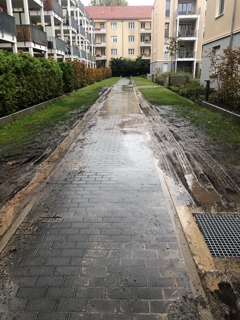 Neigung der Ränder der Dachbegrünung der Tiefgarage zu gering, da dass Wasser zu langsam abläuft, evtl. falsche Unterlage